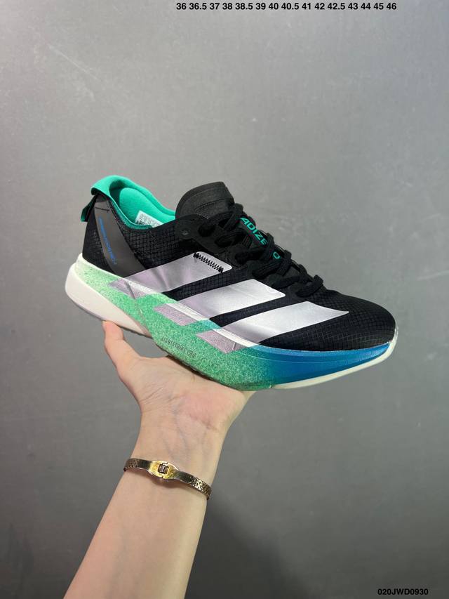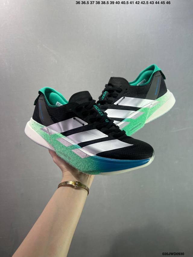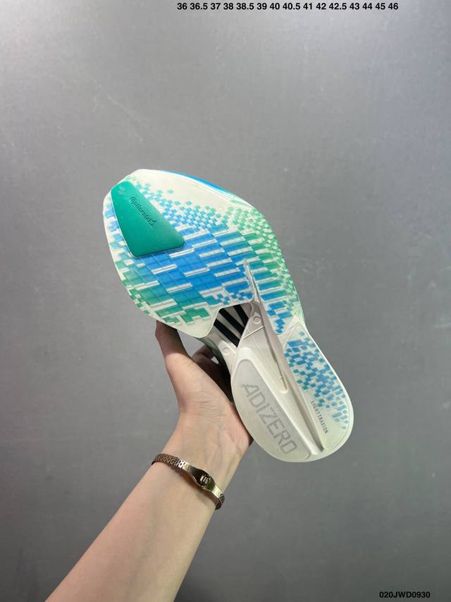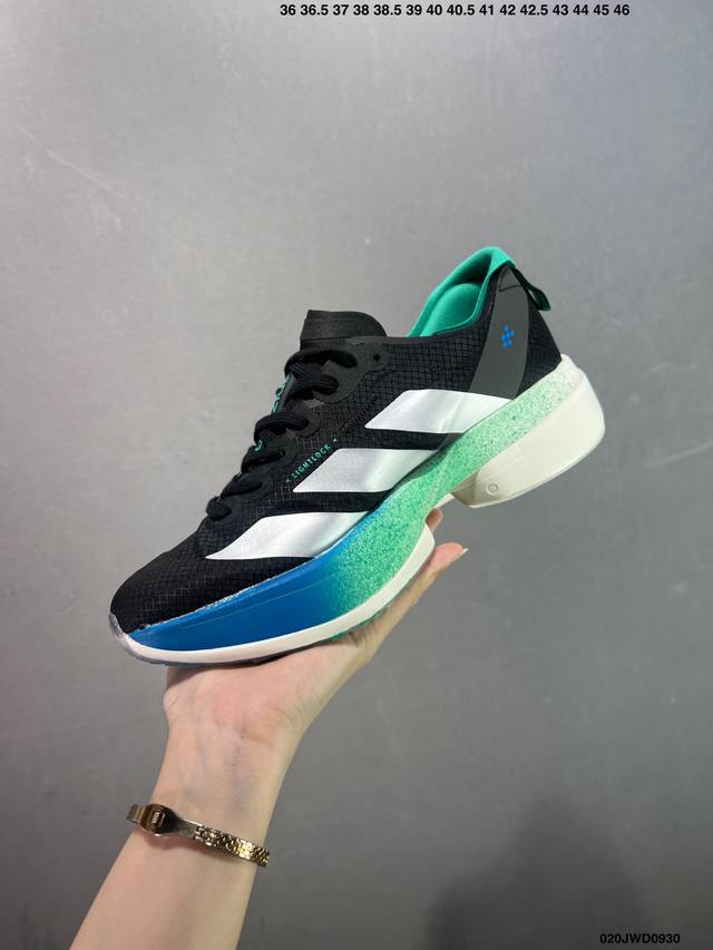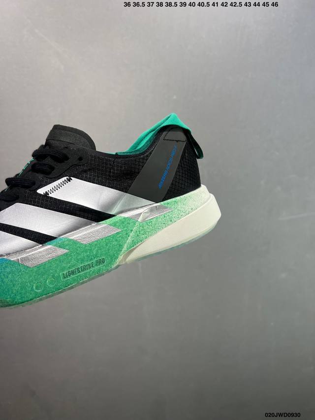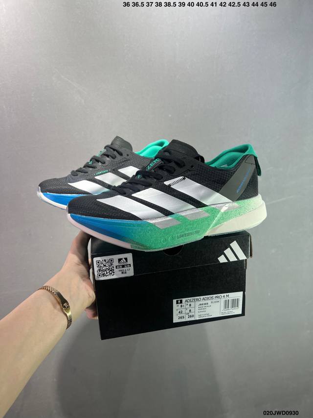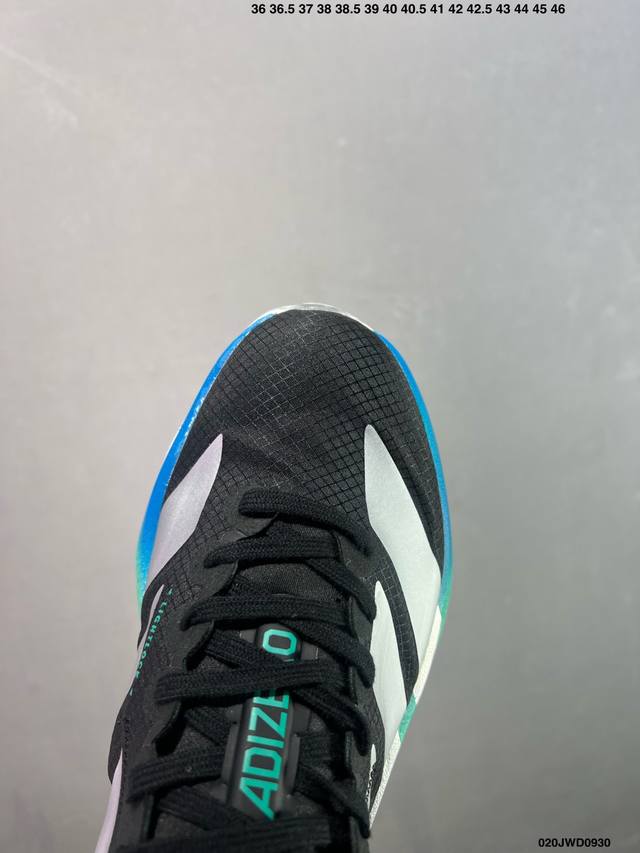 公司级Ad Adizero Adios pro 4 马拉松竞速专业跑鞋 Jr6365 Celermesh针织网面非常轻薄 纤维间的缝隙很大 可以保证跑步时的透气、排汗效果 鞋舌直接与两侧的内衬和鞋底连接在一起 在跑步过程中不会被鞋舌的左右移动所困扰 在标准鞋带孔的基础上再拓宽一组鞋带孔 适合不同脚型的需求 突破性 Energyrods 技术,有助于跑者实现更好的成绩 中底独特的Lightstrike pro泡棉材质 微弹感觉在跑步过程中给予了良好的支撑体验 对于顶级精英和高水平进阶跑者来说 Adios p
