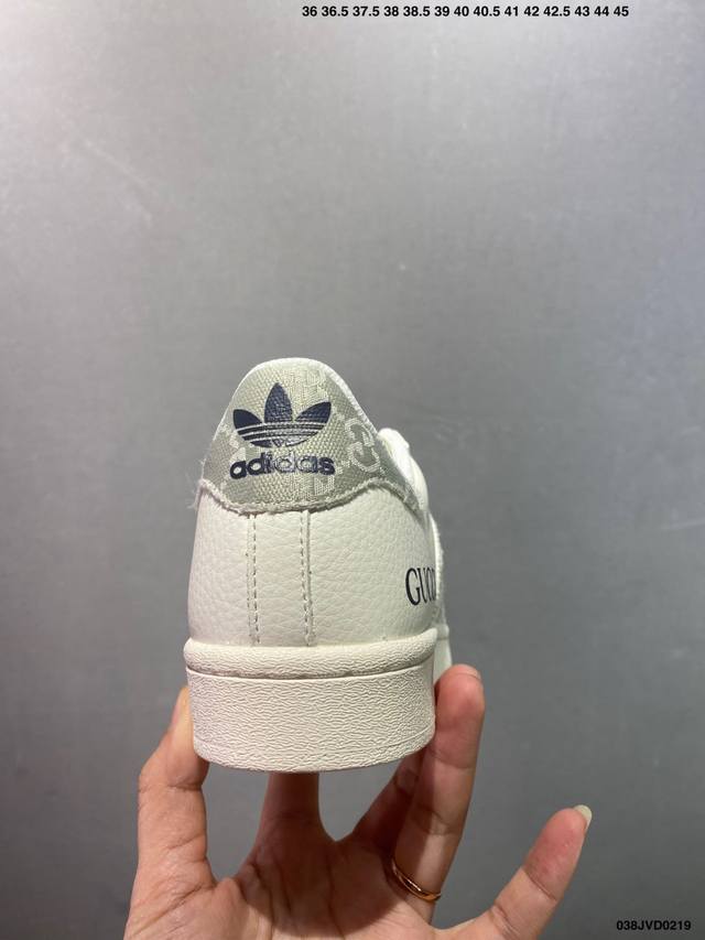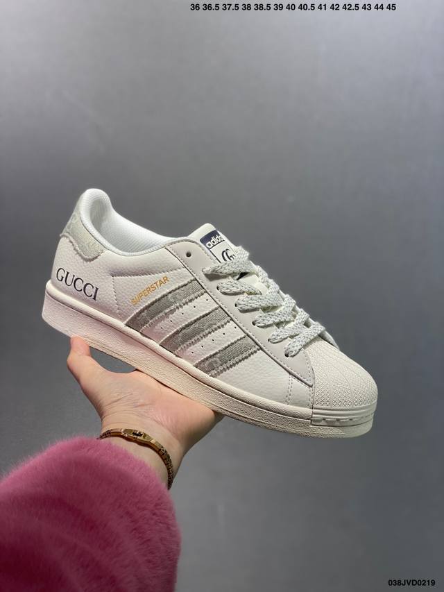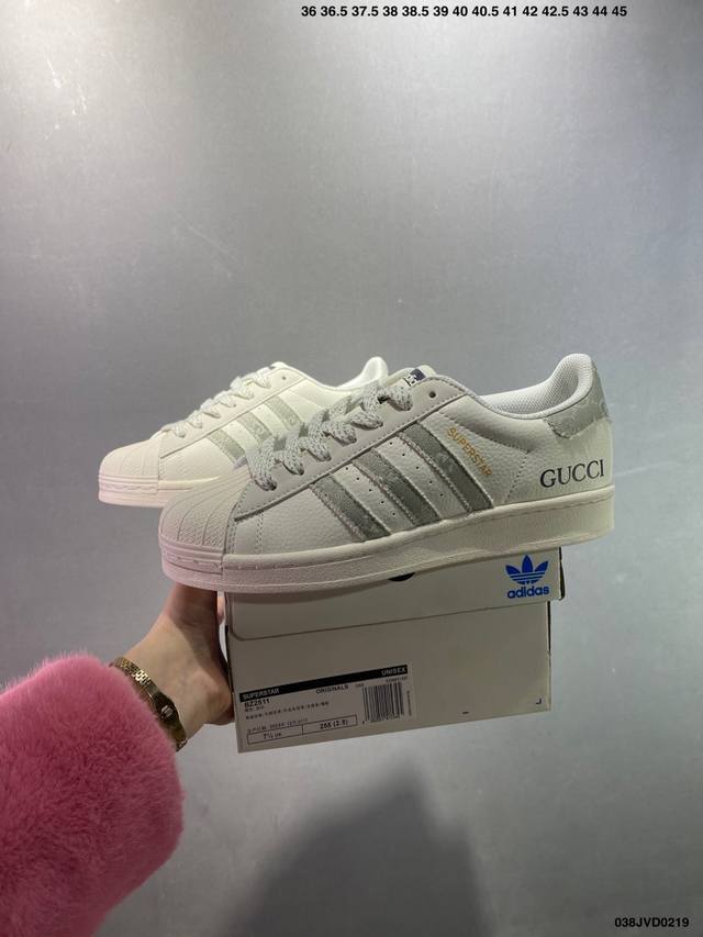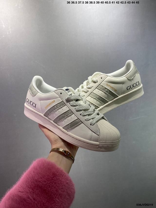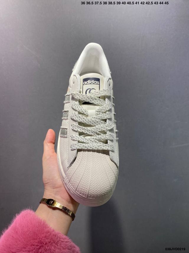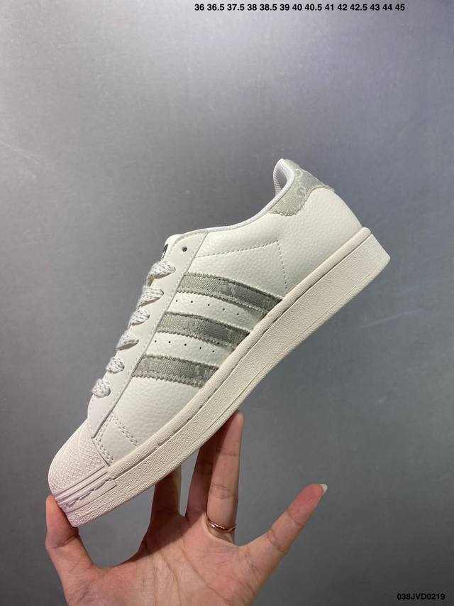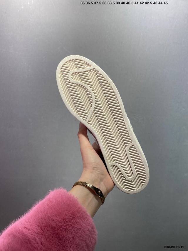 公司级Ad Originals Superstar 经典复古贝壳头板鞋 Jp7161 诞生于1969年 是第一双将全皮面鞋 身与橡胶鞋头结合在一起的低帮篮球鞋 Superstar最开始 是作为高帮篮球鞋Pro Model的低帮版本而出现的 但因为其独特和醒目的橡胶鞋头造型而让大家熟知 被大家形象地称为 Shelltoe 贝壳头 在70年代的美国职业篮球场上 接近3 4的Nba球员都将这双Superstar作为场上用鞋 80年代之后 经过不断的改良和发展 Superstar逐渐成为横跨时装、音乐、街头文化、