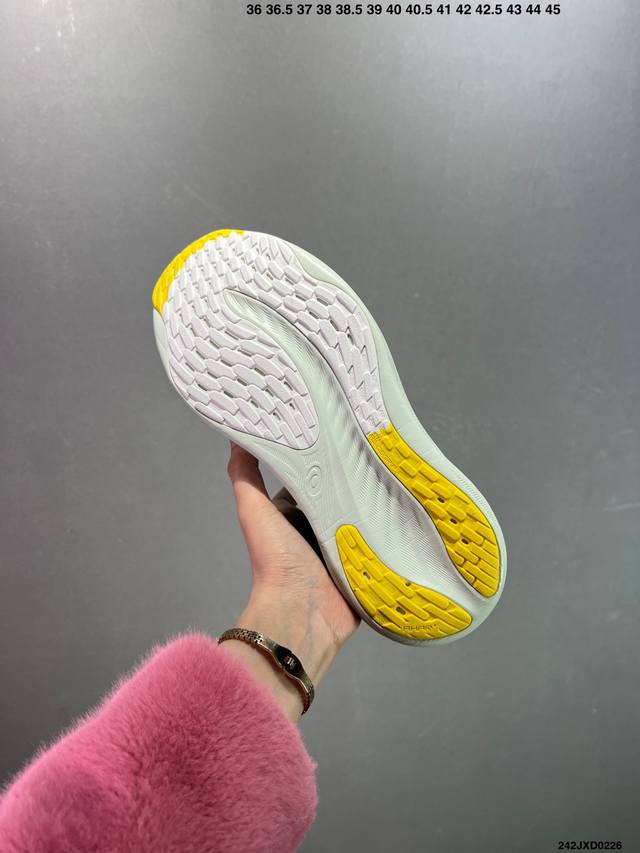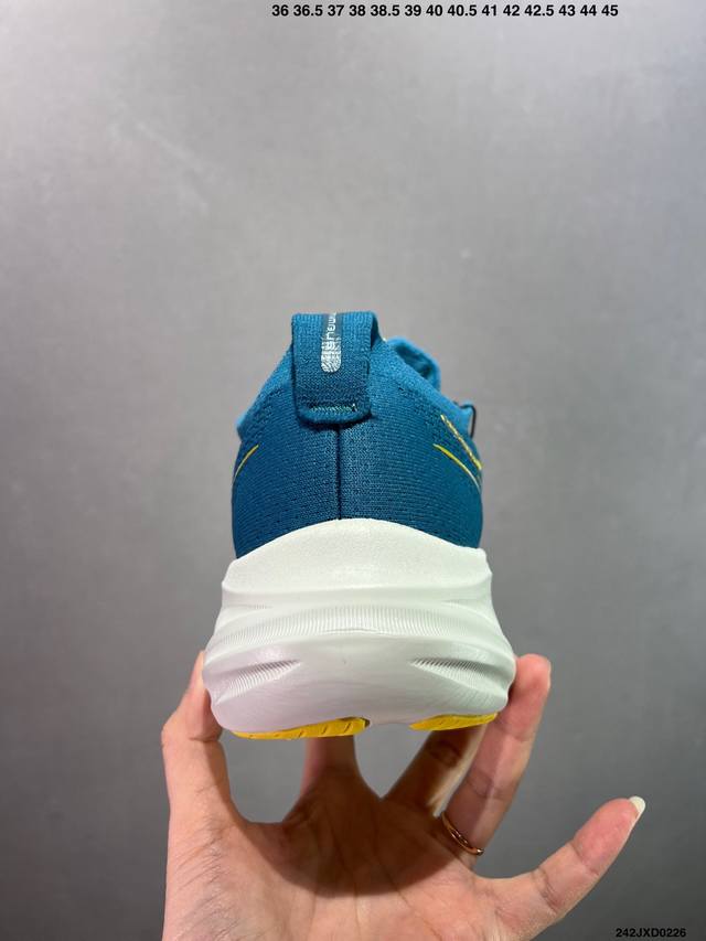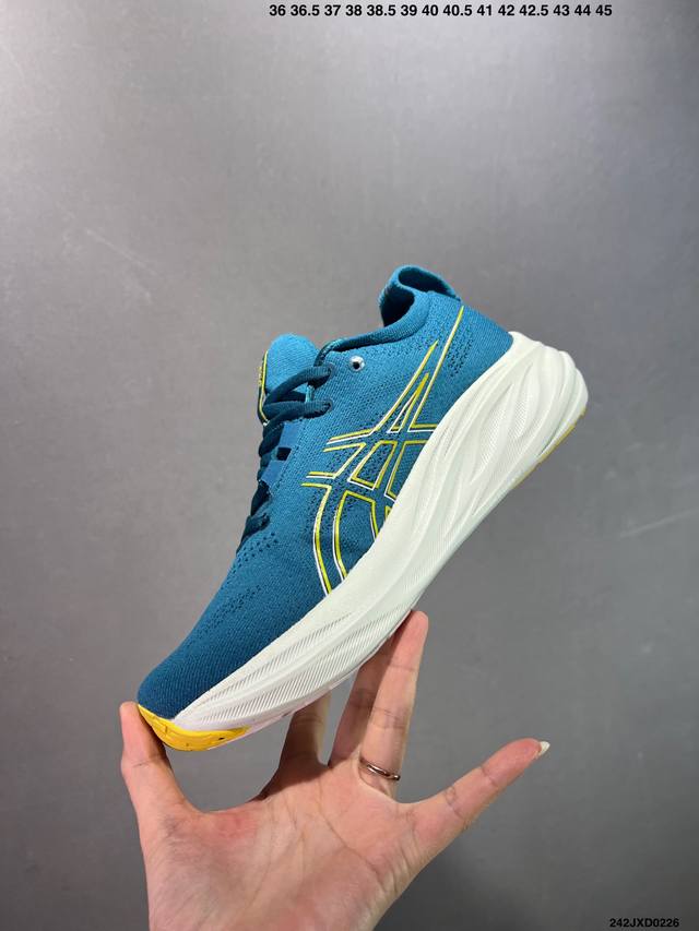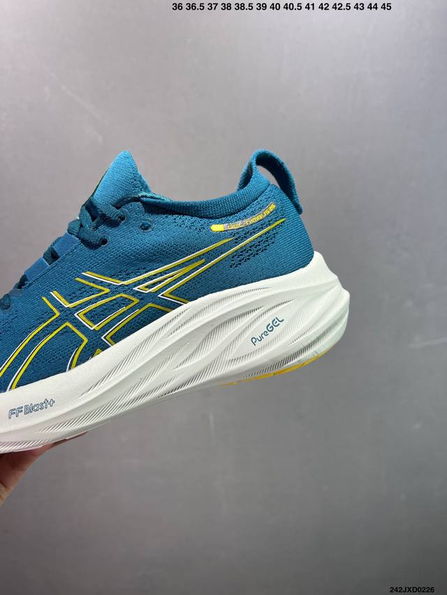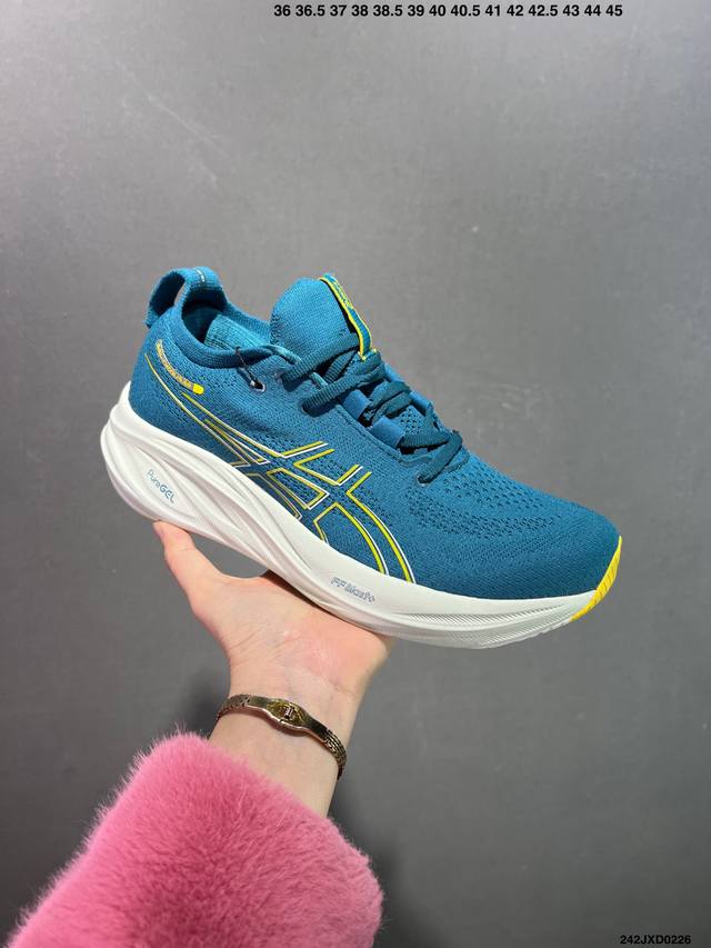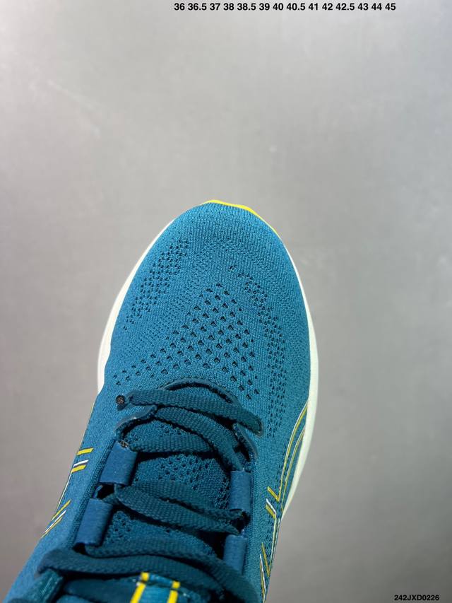 公司级Asics 亚瑟士Gel-Nimbus 26稳定跑鞋鞋面采用双层提花网面设计,提高包裹性和透气性,后跟搭载稳定系统科技T-Gel提升整体支撑力和结构感,减