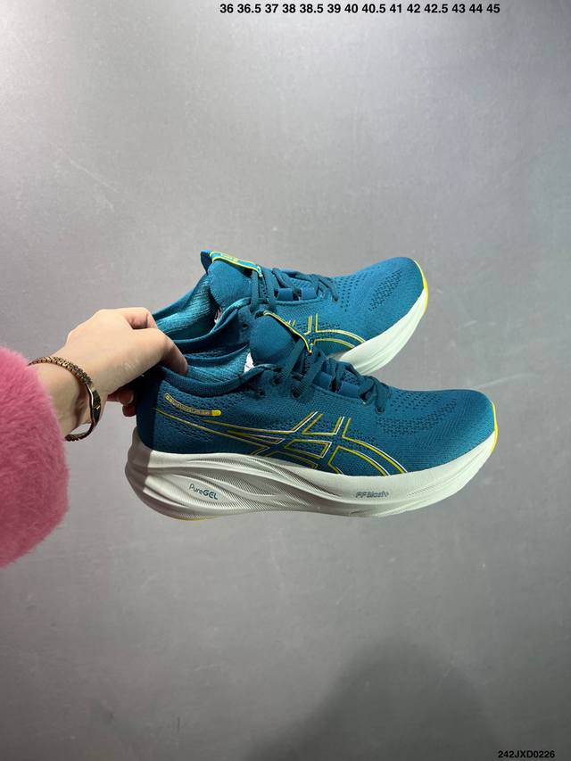 / 公司级Asics 亚瑟士Gel-Nimbus 26稳定跑鞋鞋面采用双层提花网面设计,提高包裹性和透气性,后跟搭载稳定系统科技T-Gel提升整体支撑力和结构感,减
