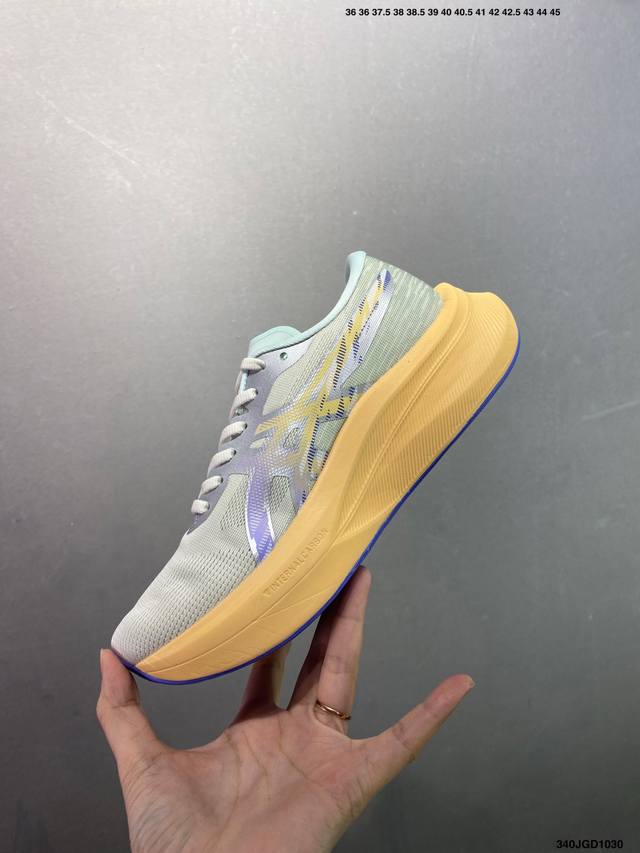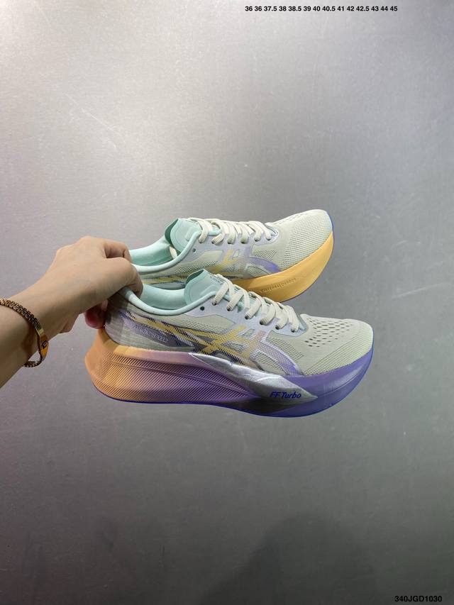 / 公司级Asics 亚瑟士Magic Speed 4稳定跑鞋鞋面 采用双层提花网面设计 提高包裹性和透气性 后跟搭载稳定系统科技T-Gel提升整体支撑力和结构感