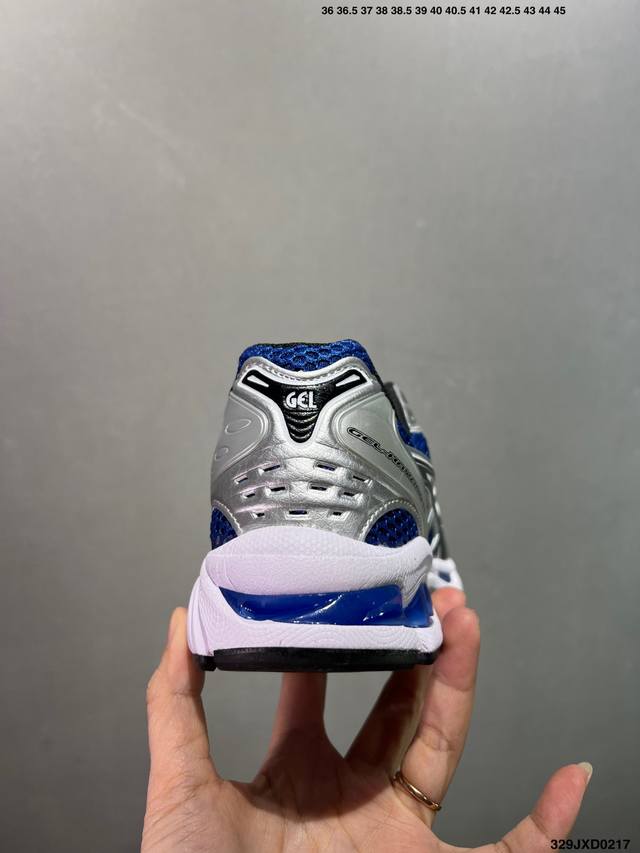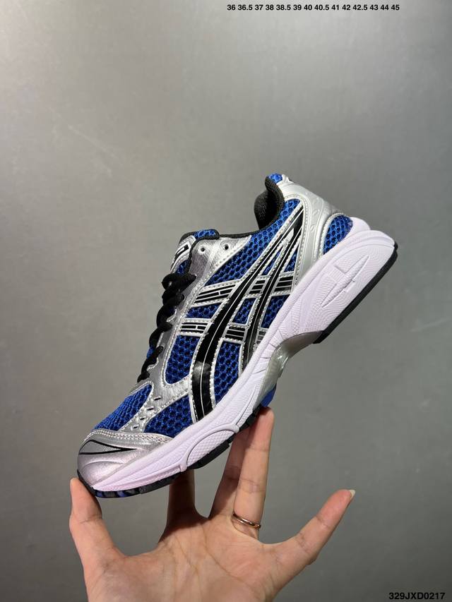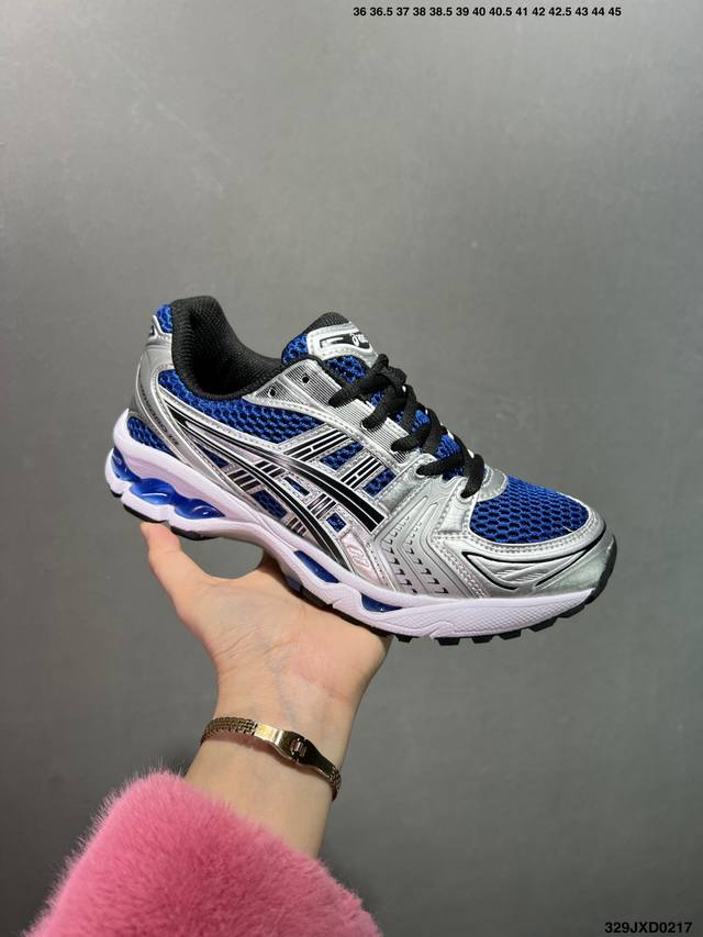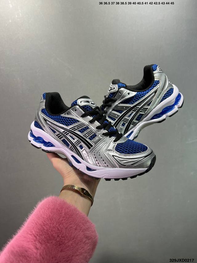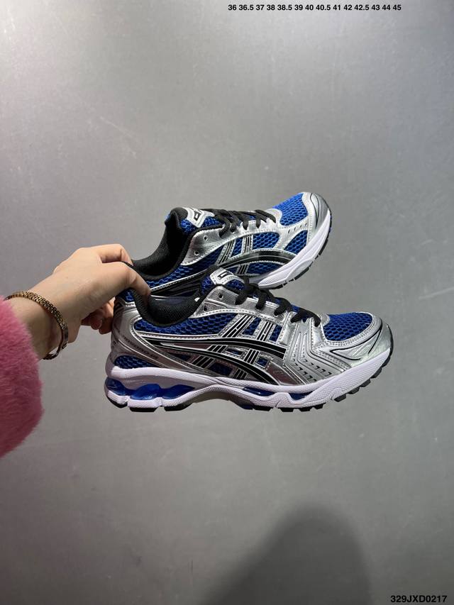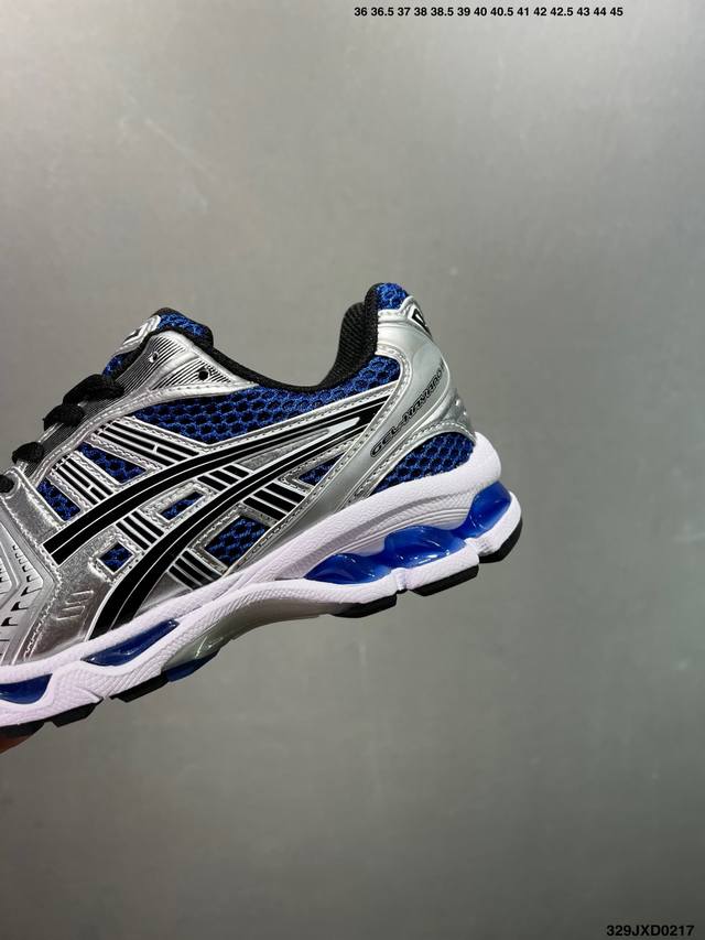 亚瑟士系列轻量缓震休闲运动跑步鞋 设计师 Hidenori Yamashita 以 Flash 一词为灵感,创造出未来感金属色鞋面,改造升级内在性能,由内而外全面革新,为 Gel-Kayano 家族传承及经典跑鞋文化的延续,创下里程碑式作品。Asics Gel Kayano 14 跑鞋重新诠释了复古的跑步形状,并以其 2000 年代后期的美学理念重新铺装,银色与蓝色的鞋面极为高档.网面铺陈与鞋面、鞋头多处细节位增添了透气性。Asics Gel Ka