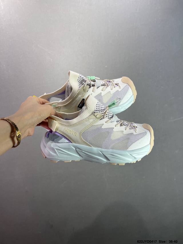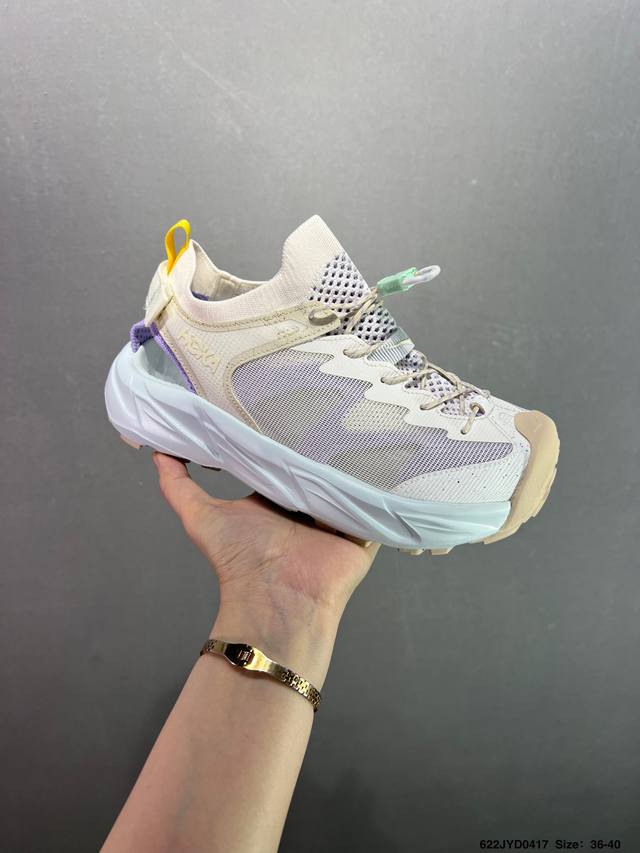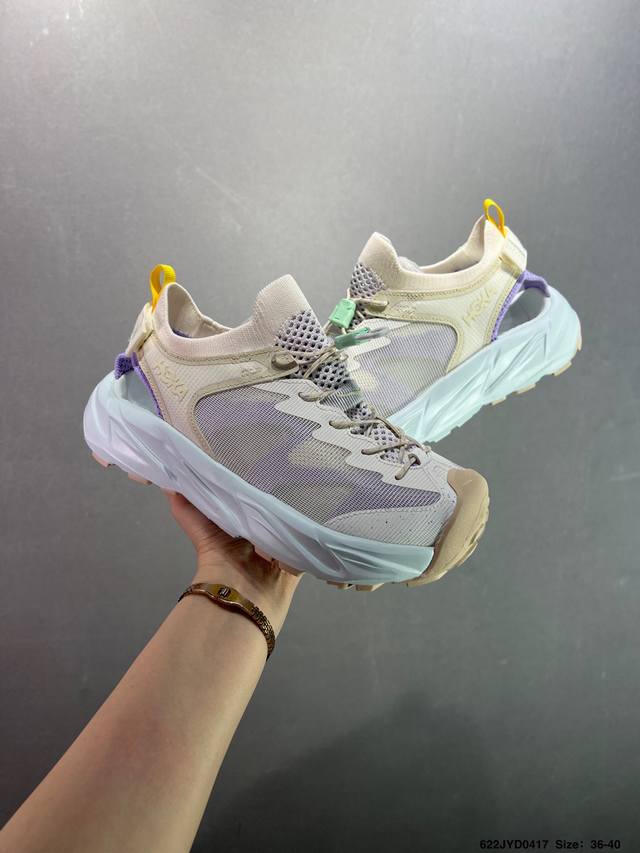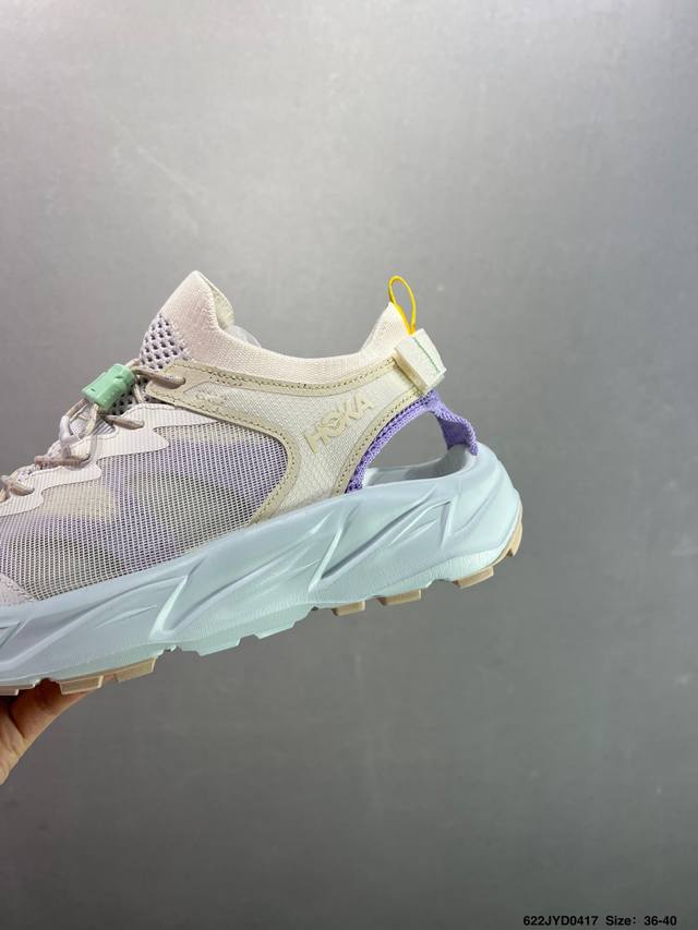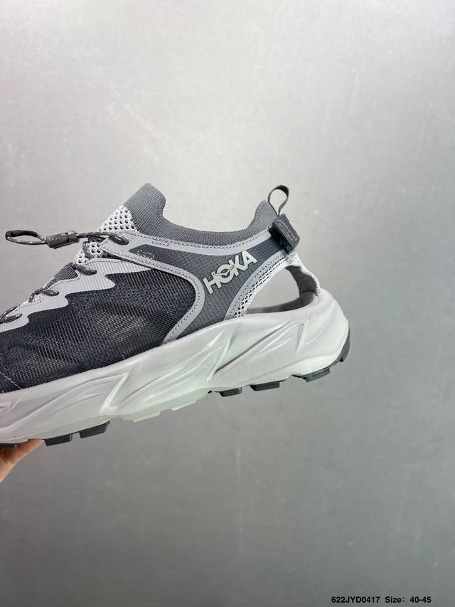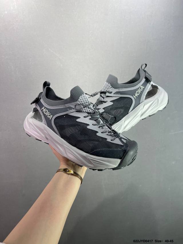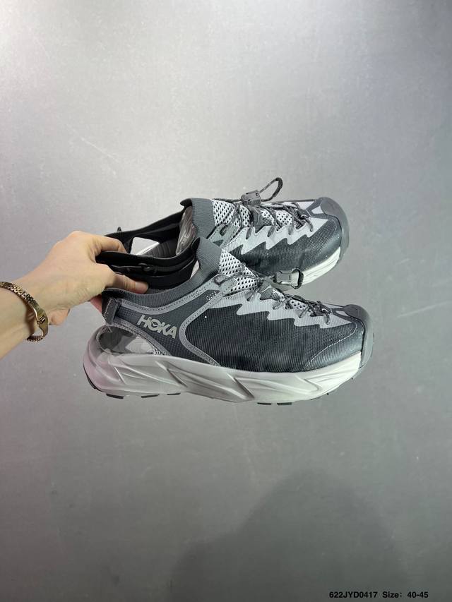作为先锋品牌的 Hoka One One总是以独特的方式,Hopara是一款溯溪鞋,又名排水鞋,可长期用于涉水和溯溪,保护脚底和脚趾的安全和舒适。-鞋面材料速干,透气,耐磨;鞋底防滑,耐磨,抓地能力强,出于安全考虑,设计要求较高-涉水溯溪过程中,水,泥沙,可以直接从鞋内大孔排出,细纹鞋底使在岩石上抓地能力强,避免打滑,而上路后,鞋面具有快干透气等优点。