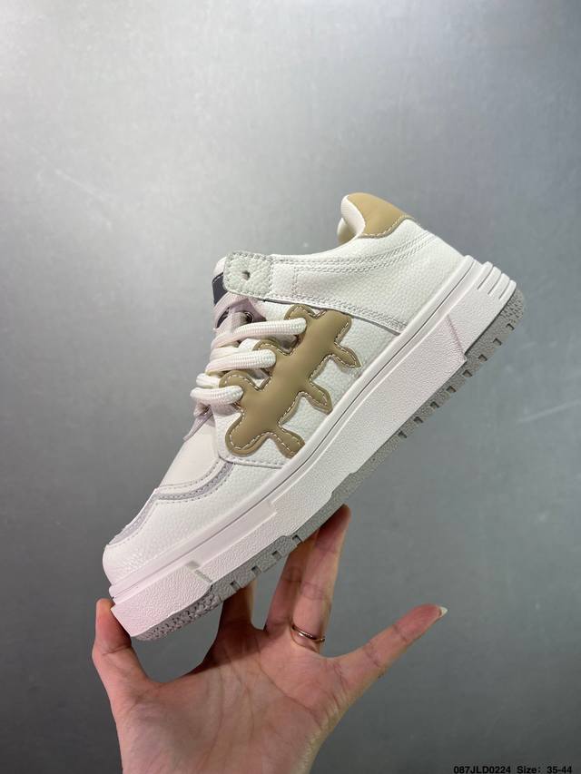 #重新选材皮革面料,改变传统帆布设计,将皮革和复古帆布鞋搭配,用大鞋眼金花三弄Logo的造型设计,更加突出品牌辨识度,鼓包创新梅花凸起工艺,梅花涂边细节,皮革质感满满