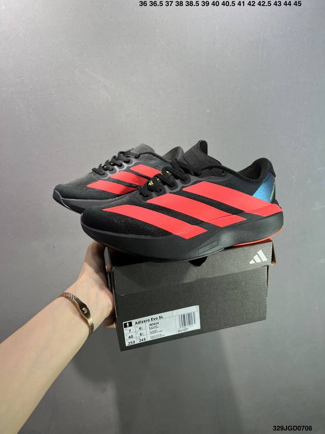 / 带碳板Ad Adizero Evo Sl Jr3414 阿迪超轻透气缓震跑鞋 #以令人难以置信的138克重量,刷新了跑鞋轻量化的记录,阿迪在材料科学和工艺技术上