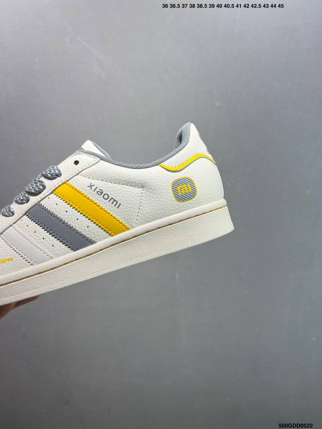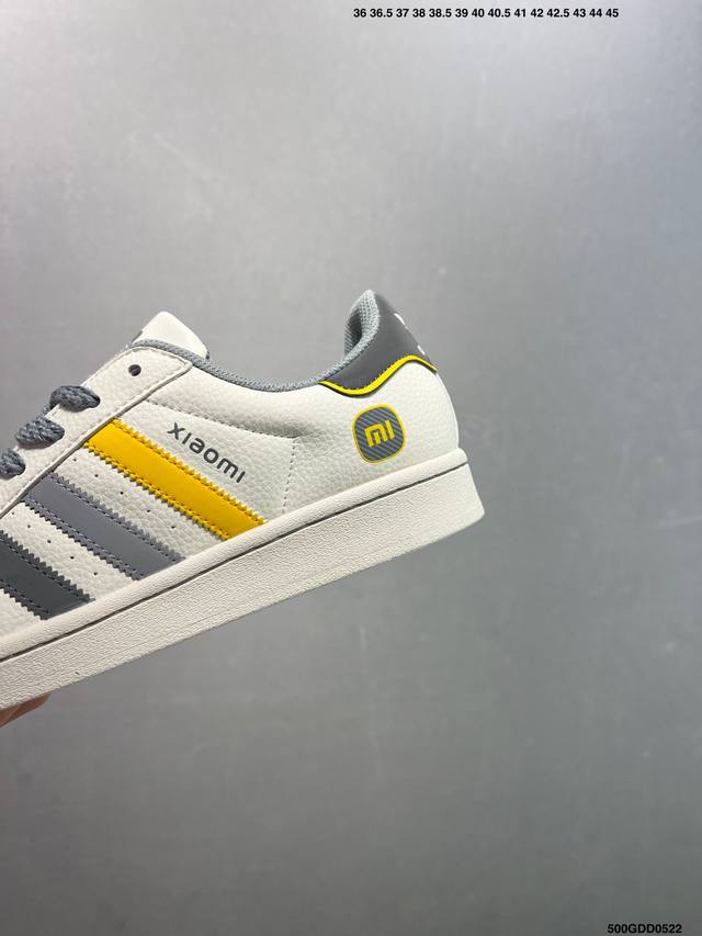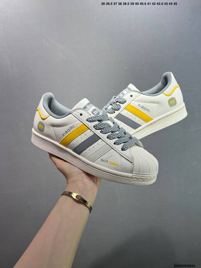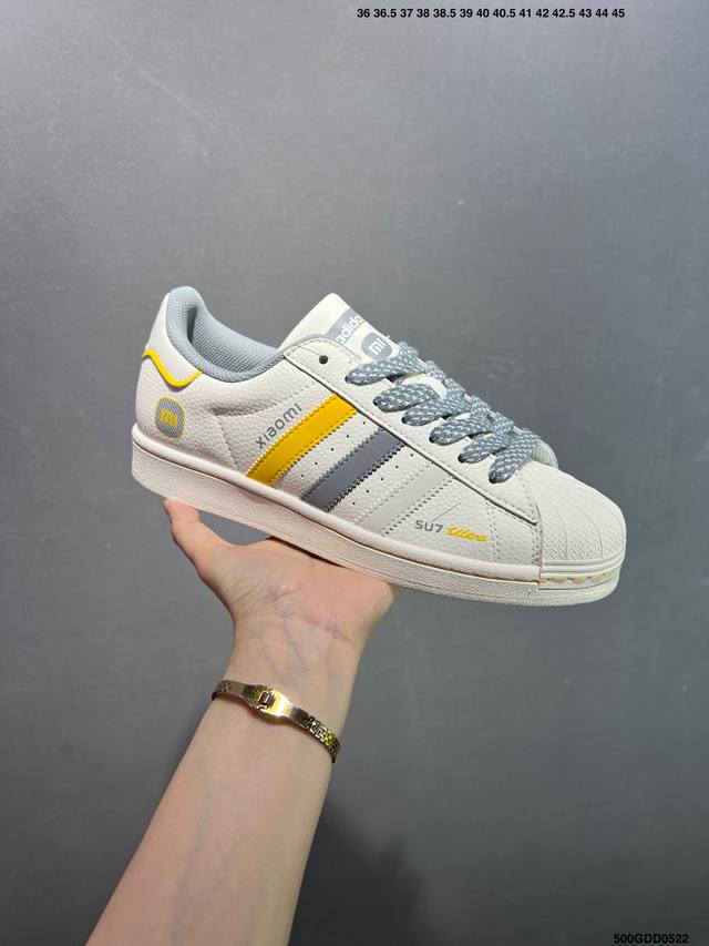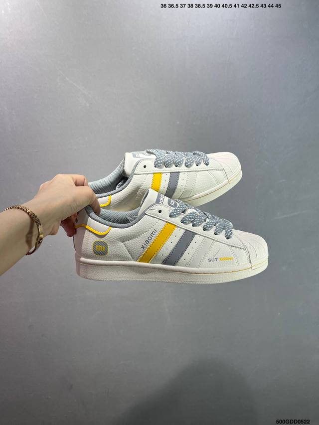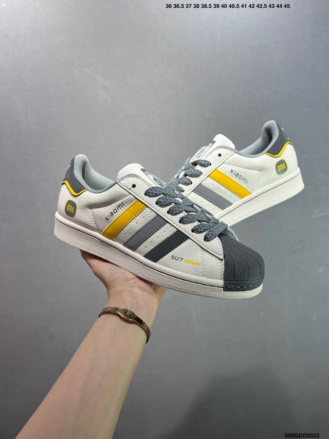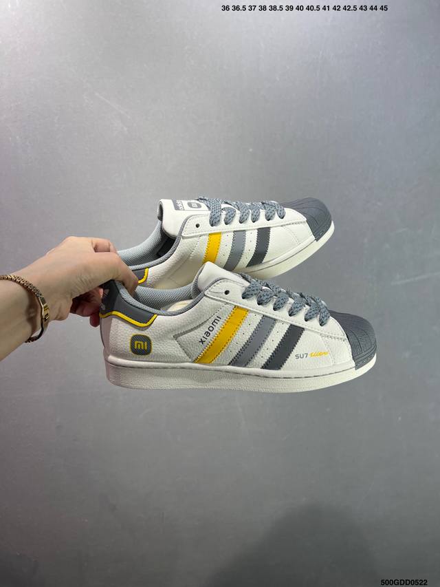 公司级Ad Originals Superstar 经典复古贝壳头板鞋 Jp9310 诞生于1969年 是第一双将全皮面鞋 身与橡胶鞋头结合在一起的低帮篮球鞋 Superstar最开始 是作为高帮篮球鞋pro Model的低帮版本而出现的 但因为其独特和醒目的橡胶鞋头造型而让大家熟知 被大家形象地称为 Shelltoe 贝壳头 在70年代的美国职业篮球场上 接近3 4的Nba球员都将这双Superstar作为场上用鞋 80年代之后 经过不断的改良和发展 Superstar逐渐成为横跨时装 音乐