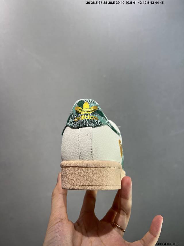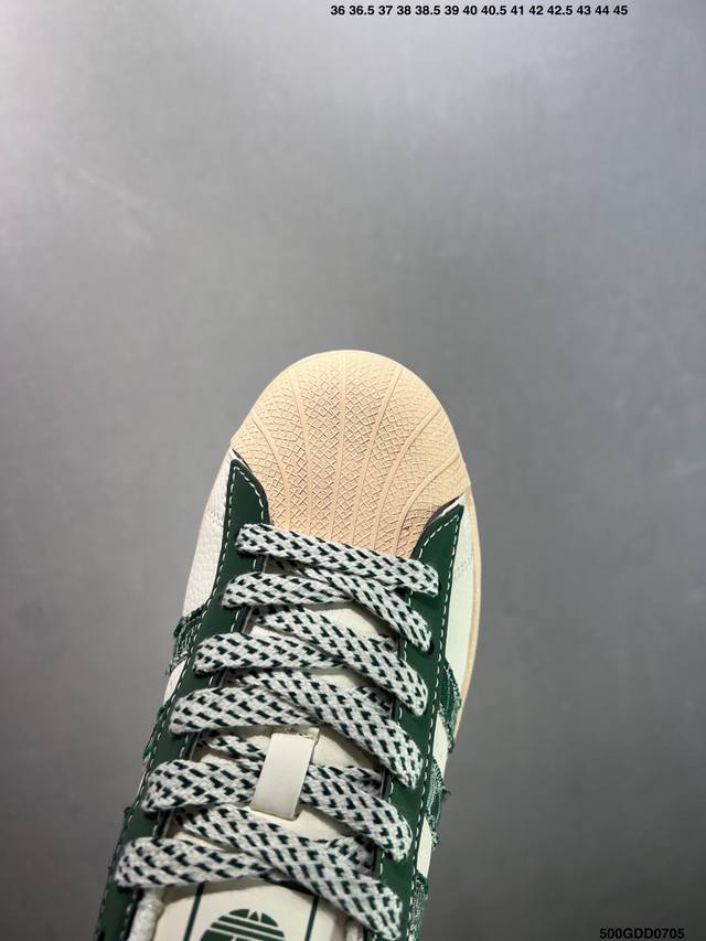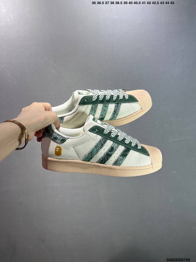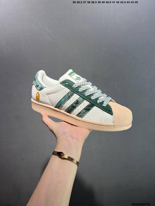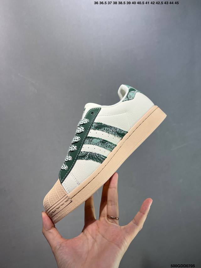 公司级Ad Originals Superstar 经典复古贝壳头板鞋 Jp9310 诞生于1969年 是第一双将全皮面鞋 身与橡胶鞋头结合在一起的低帮篮球鞋 Superstar最开始 是作为高帮篮球鞋Pro Model的低帮版本而出现的 但因为其独特和醒目的橡胶鞋头造型而让大家熟知 被大家形象地称为”Shelltoe“贝壳头 在70年代的美国职业篮球场上 接近3 4的Nba球员都将这双Superstar作为场上用鞋 80年代之后 经过不断的改良和发展 Superstar逐渐成为横跨时装、音乐