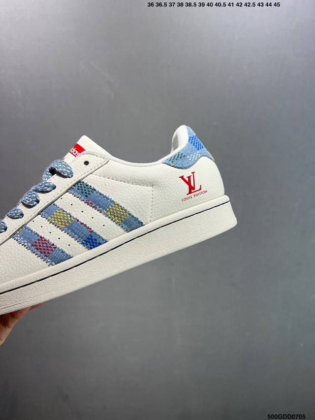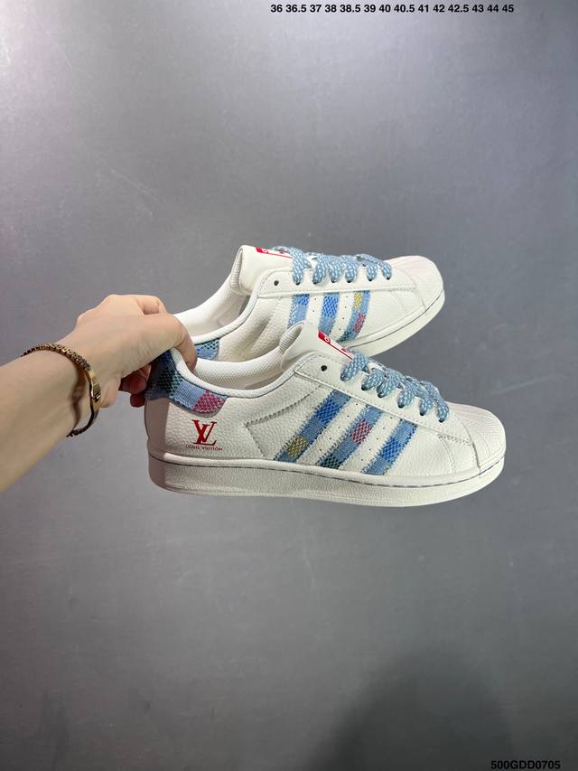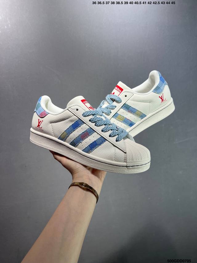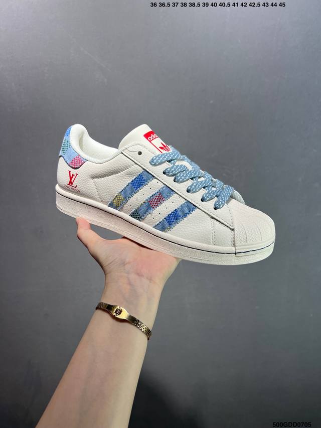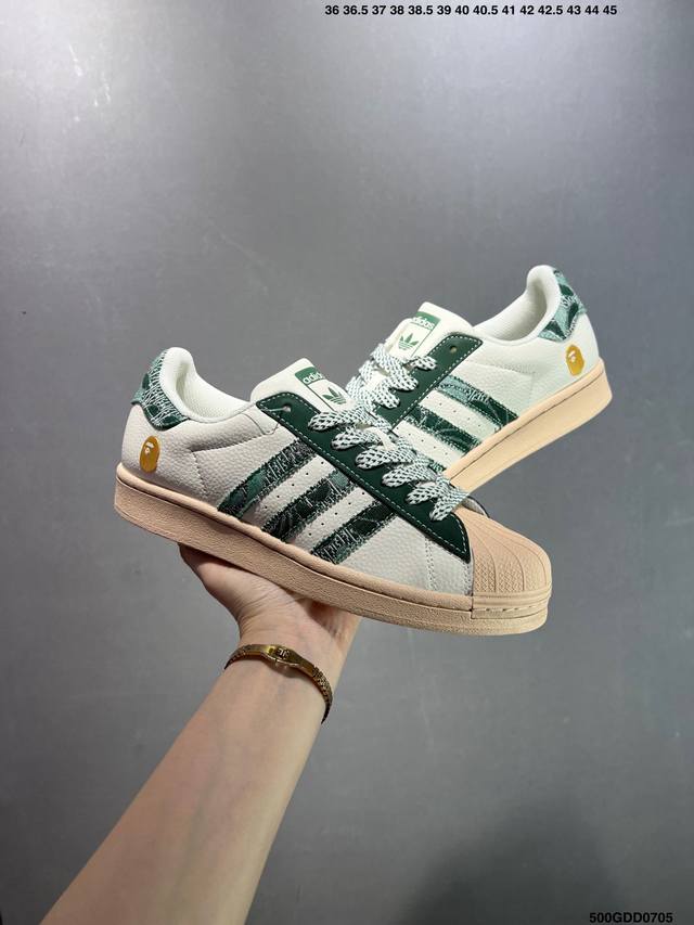 公司级Ad Originals Superstar 经典复古贝壳头板鞋 Jp9310 诞生于1969年 是第一双将全皮面鞋 身与橡胶鞋头结合在一起的低帮篮球鞋 Superstar最开始 是作为高帮篮球鞋Pro Model的低帮版本而出现的 但因为其独特和醒目的橡胶鞋头造型而让大家熟知 被大家形象地称为”Shelltoe“贝壳头 在70年代的美国职业篮球场上 接近3 4的Nba球员都将这双Superstar作为场上用鞋 80年代之后 经过不断的改良和发展 Superstar逐渐成为横跨时装、音乐