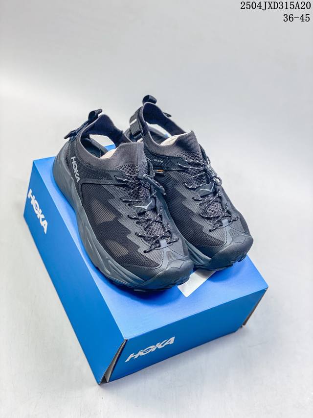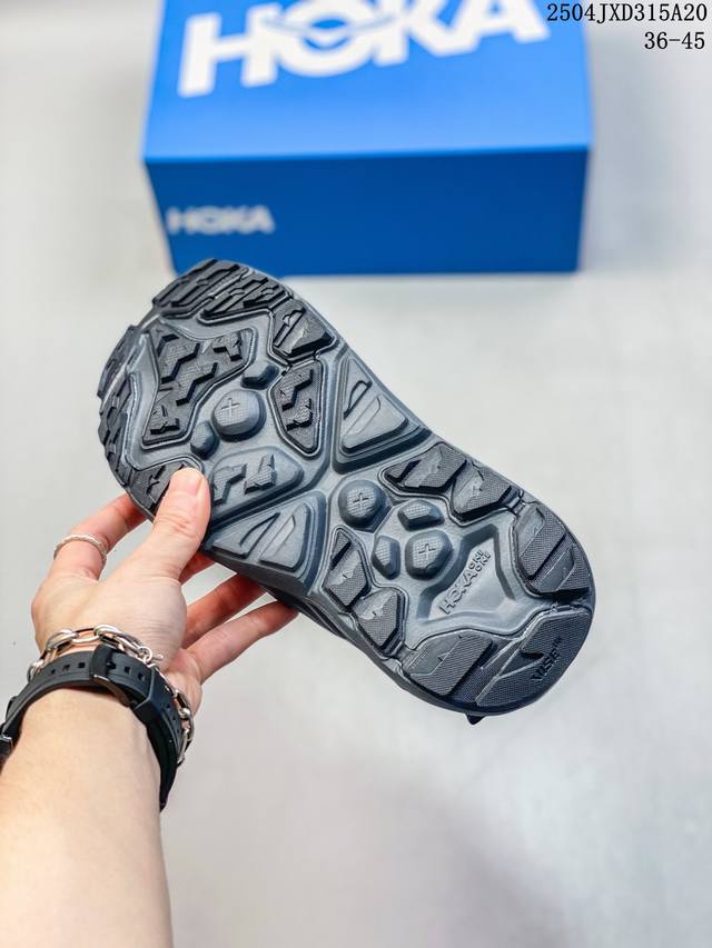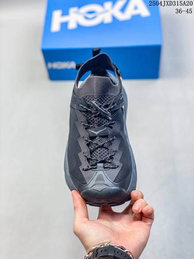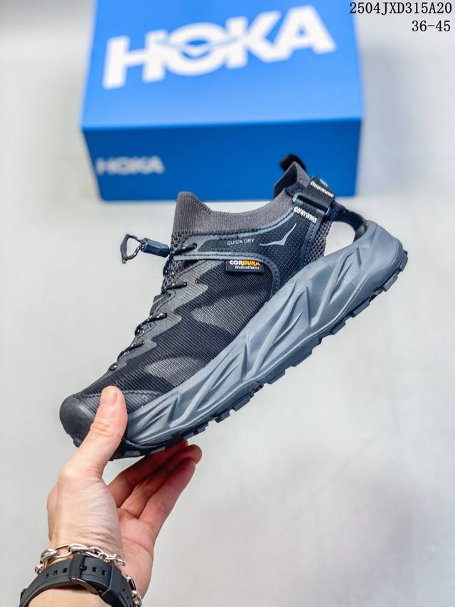 作为先锋品牌的 Hoka One One总是以独特的方式,Hora是一款溯溪鞋,又名排水鞋,可长期用于涉水和溯溪,保护脚底和脚趾的安全和舒适。-鞋面材料速干,透气,耐磨;鞋底防滑,耐磨,抓地能力强,出于安全考虑,设计要求较高-涉水溯溪过程中,水,泥沙,可以直接从鞋内大孔排出,细纹鞋底使在岩石上抓地能力强,避免打滑,而上路后,鞋面具有快干透气等优点。
