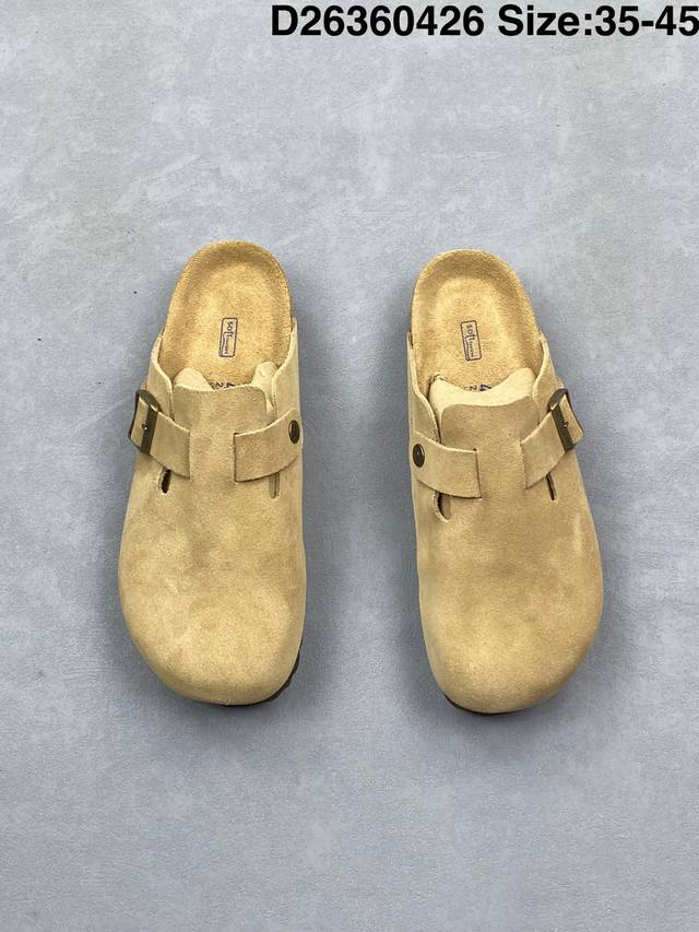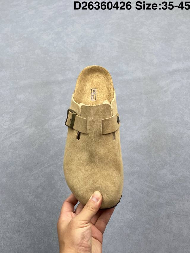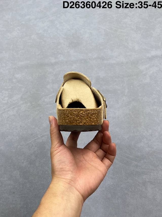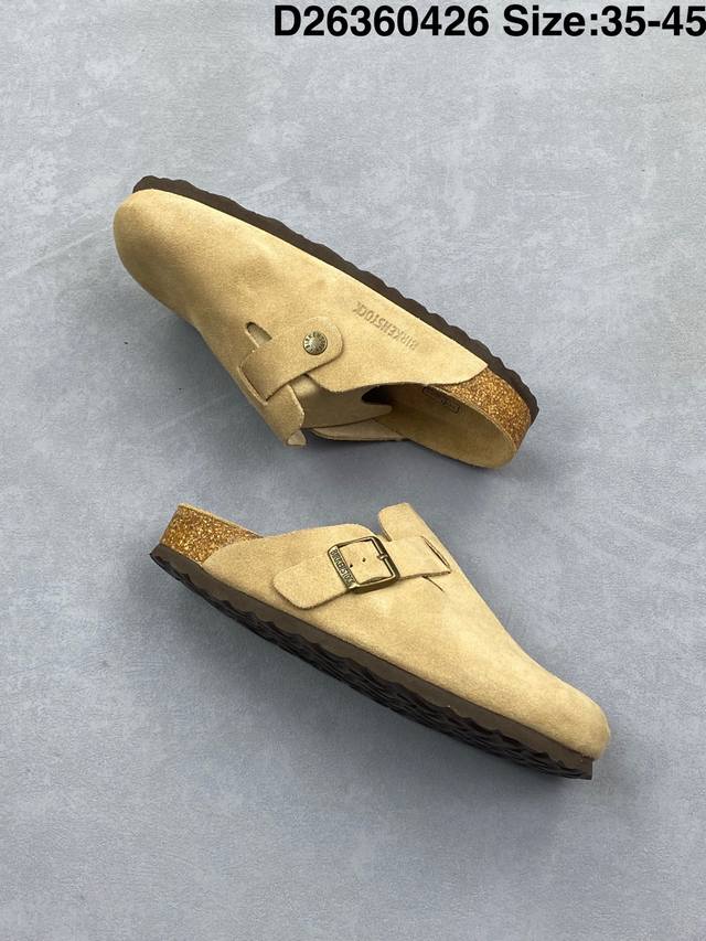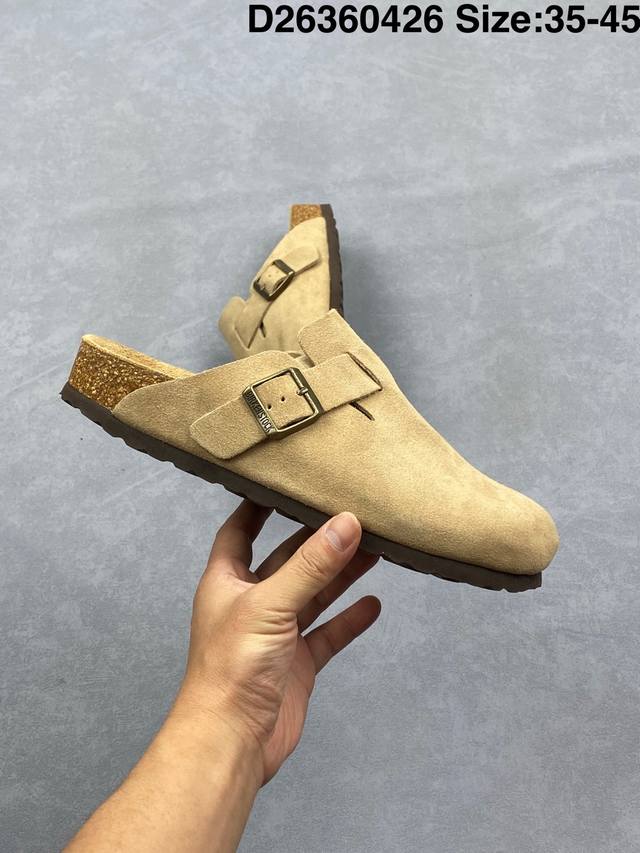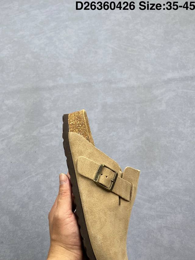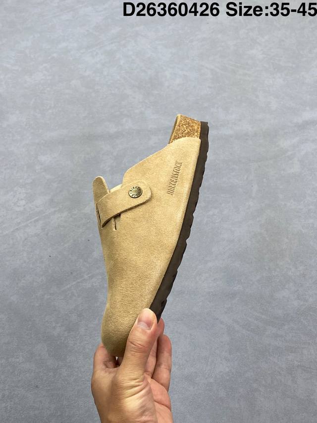 采用柔软牛皮绒面革里衬皮毛一体鞋面材质#中底鞋床搭载波状外形缓震软木橡胶#外置Eva轻量片装外底舒适又时髦,潮人都在穿德国百年知名鞋履品牌 勃肯Birkenstock Boston Suede Shearling 波士顿系列士低帮牛皮绒面革复古软木底包头露跟休闲鞋