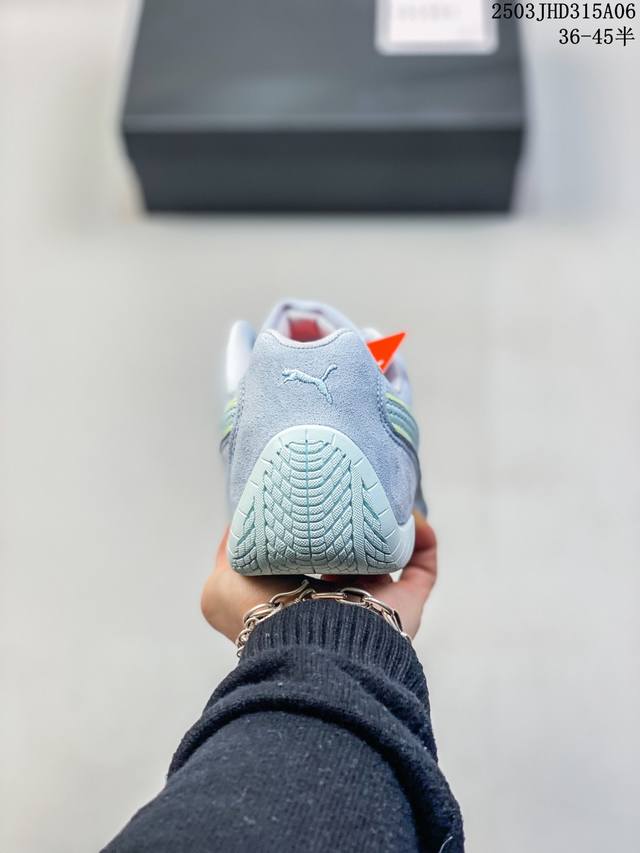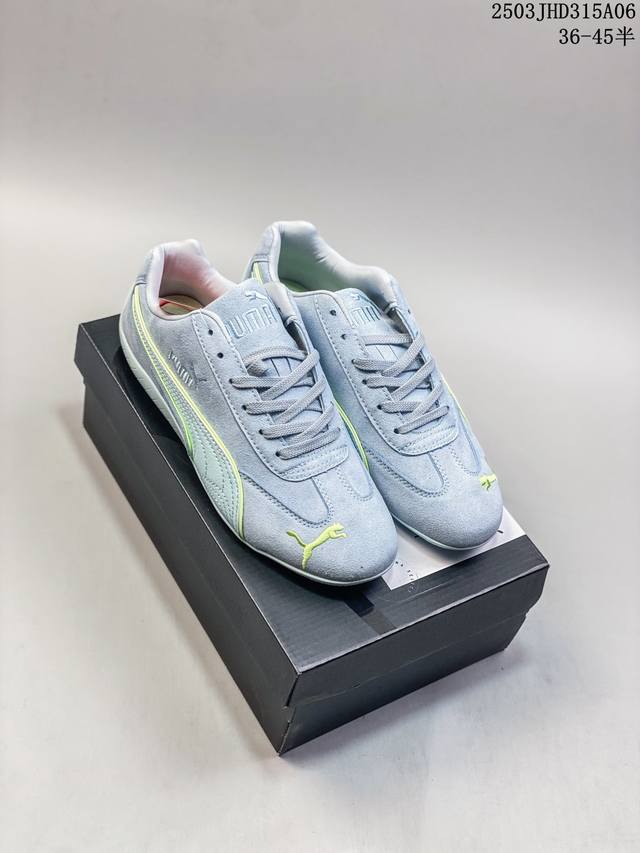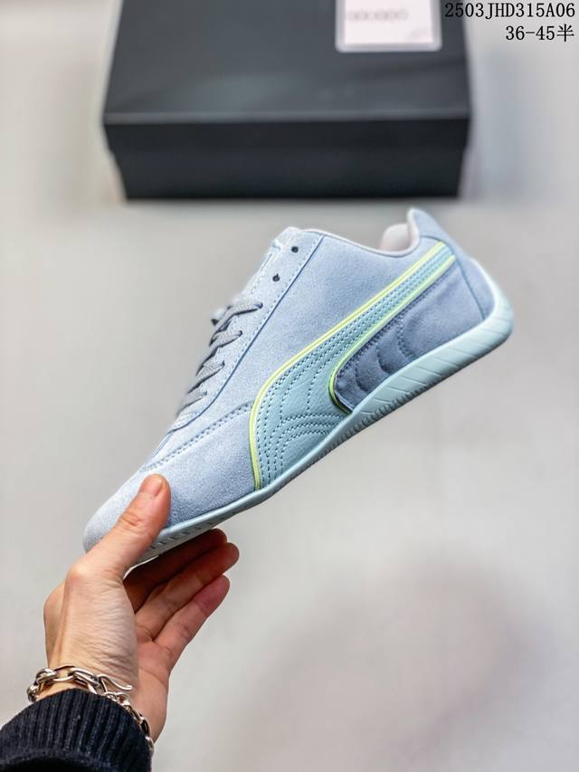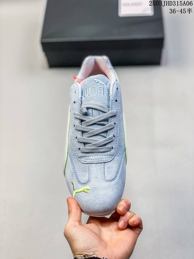 Speedca Og 极速赛车系列低帮德训风拼接复古百搭休闲运动赛车鞋 鞋款从80、90年代赛车手所穿的防火赛车鞋为原型,鞋身线条模仿了赛车的流线廓形,体现了空气动力学原理的结构。简约流畅的外观,恰好又和贯穿其中的Formstrip Logo融合恰到好处,视觉上细节丰富且协调。本次Speed Og鞋款归来,最大看点自然式保留了窄版鞋型以及薄底构造。这两年各品牌鞋底越做越厚,Speed反其道而行之,上脚几乎无鞋底的效果带来耳目一新的视觉体验。鞋面依旧是以质感细腻的麂皮材质打造,并且大面积近乎全包
