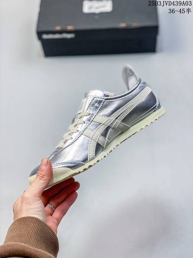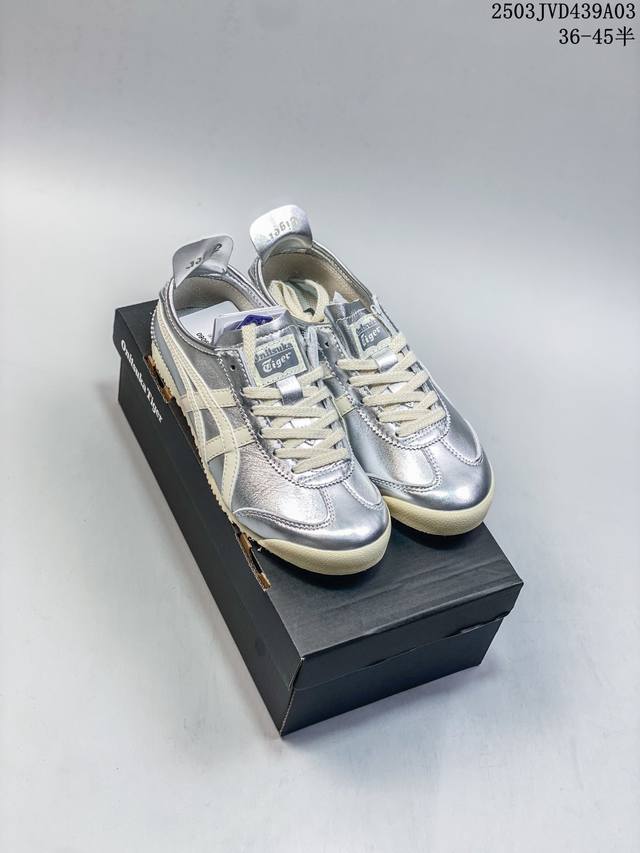 Asics/亚瑟士 男女鞋真标半码制,原楦原纸版开发版型,采用粒面头层皮革组合太空革饰条鞋面材质,内嵌冲孔缓震Ortholite(欧索莱)透气吸汗鞋垫贴附人体工学足弓乳胶模块,搭载定型中底纸板及钢印效果,外置环保切片组合轻质Eva发泡防滑橡胶外底经典传承及创新锐意,日产经典老牌-鬼塚虎/Onitsuka Tiger Mexico 66经典墨西哥系列低帮复古经典百搭休闲皮革慢跑鞋“皮革米灰藏青蓝 Dl408-1659