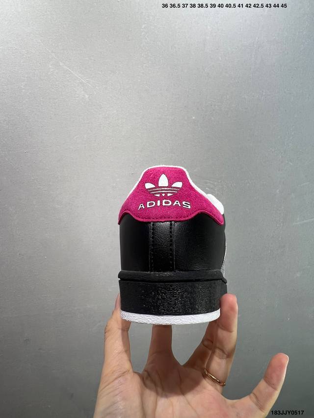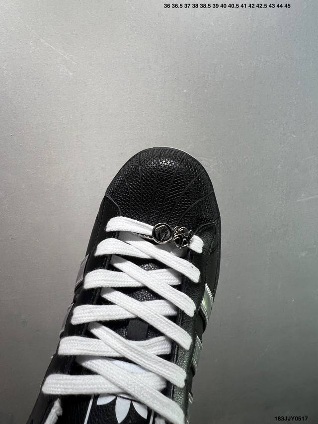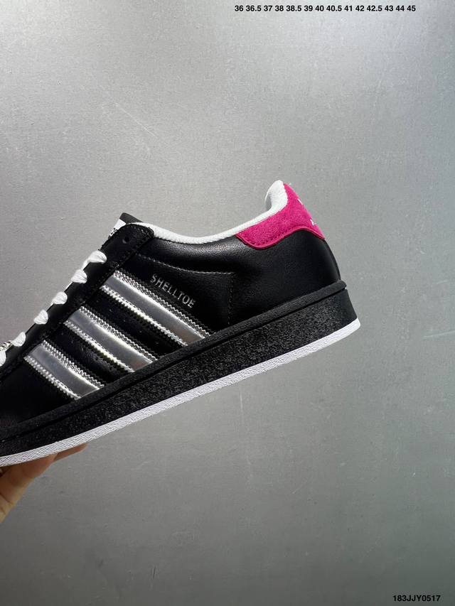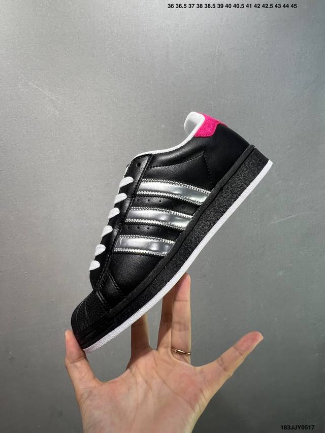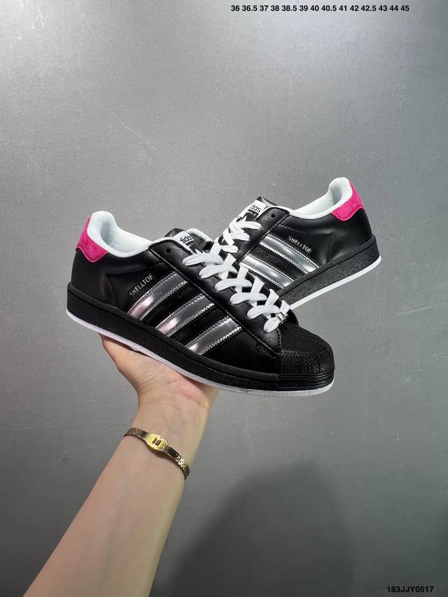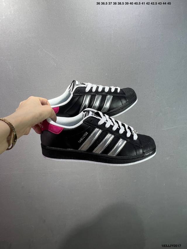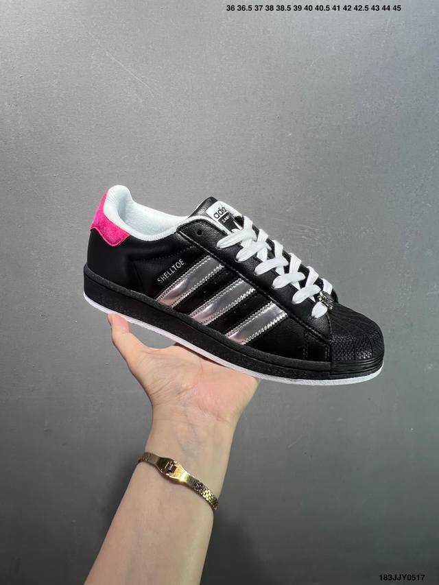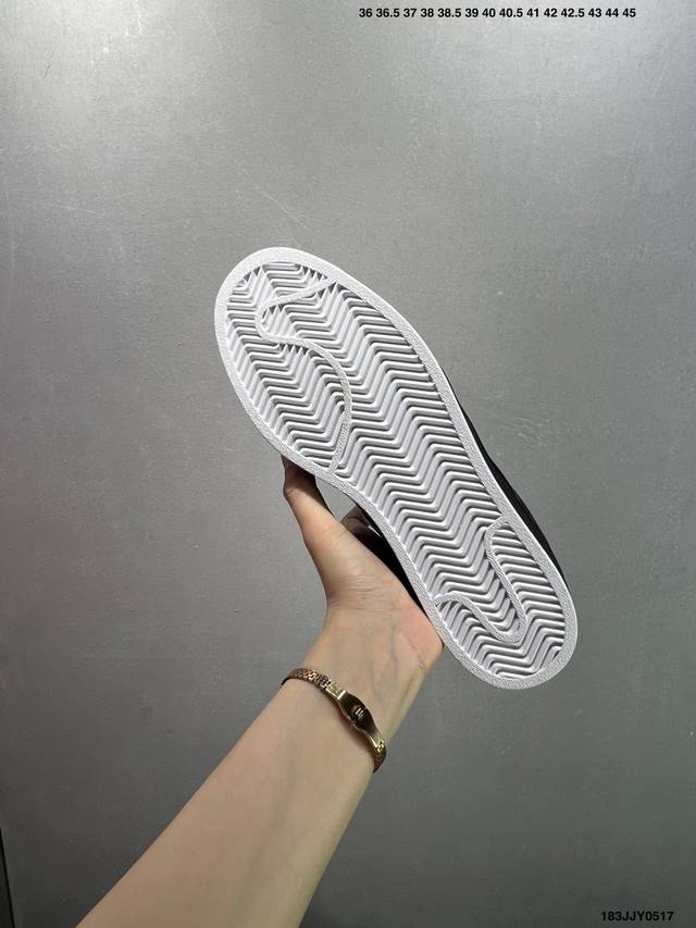 ad Originals Superstar 经典复古贝壳头板鞋 Jp9310 诞生于1969年 是第一双将全皮面鞋 身与橡胶鞋头结合在一起的低帮篮球鞋 Superstar最开始 是作为高帮篮球鞋pro Model的低帮版本而出现的 但因为其独特和醒目的橡胶鞋头造型而让大家熟知 被大家形象地称为 Shelltoe 贝壳头 在70年代的美国职业篮球场上 接近3 4的Nba球员都将这双Superstar作为场上用鞋 80年代之后 经过不断的改良和发展 Superstar逐渐成为横跨时装 音乐 街头文化 休闲和