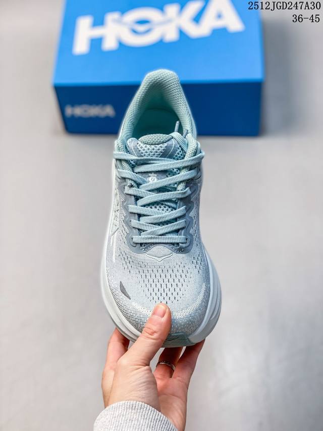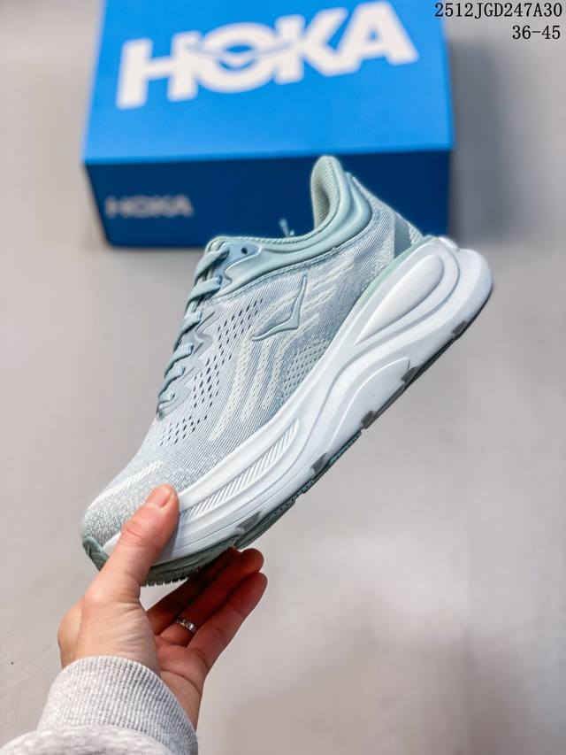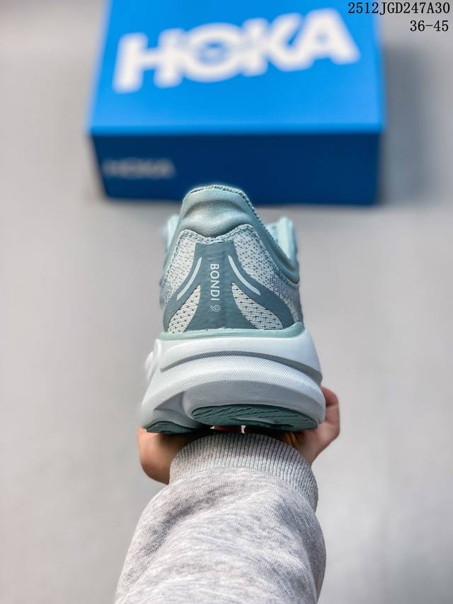 Hoka畅行无阻 Hoka One One Bondi 9 舒适百搭耐磨轻便 低帮跑步鞋 男女款。Bondi 9 最显著的变化在于其鞋底单元,原本扎实可靠的鞋底变得更加厚实,其厚度堪称 “近乎巨型尺寸”,对于钟情超厚底结构的消费者而言,无疑是最佳选择之一。在 Hoka 的新季展示会上,Bondi 9 以全新造型亮相,不仅外观升级,性能也得到官方宣称的显著提升。在重量方面,以美国男士 10 码为例,它比前代整体轻将近一盎司,实现了轻量化突破。这双鞋搭载 Hoka 最大缓冲中底,使鞋底增加两毫米高度,同时加持