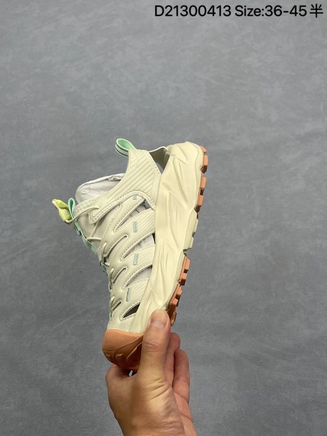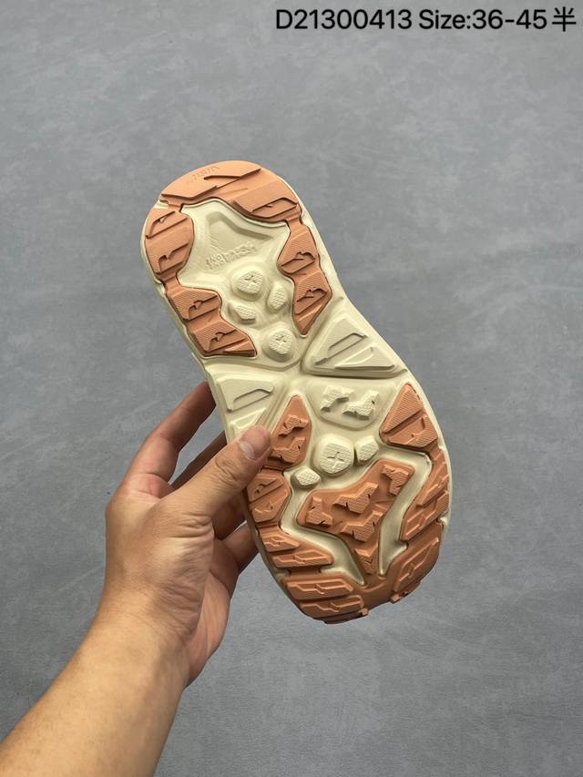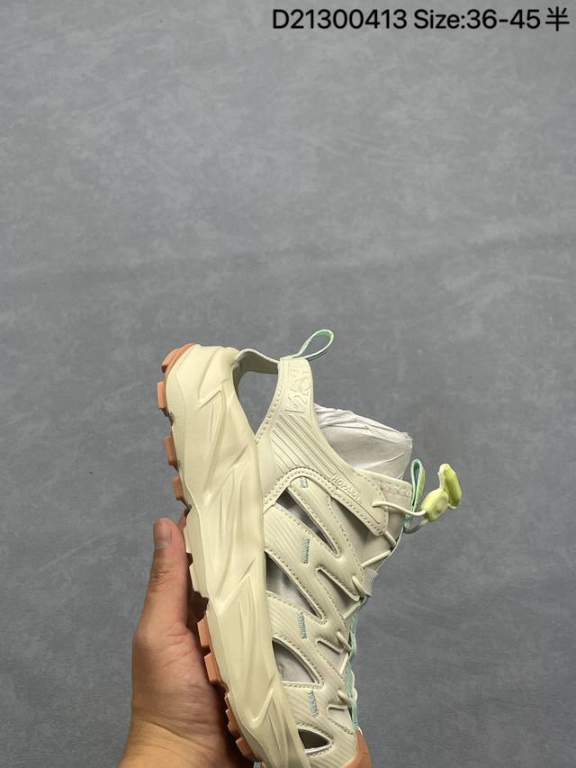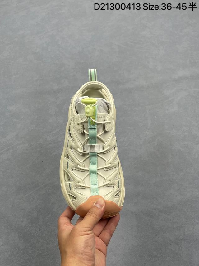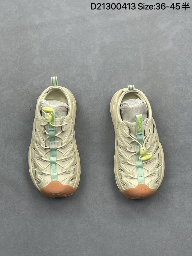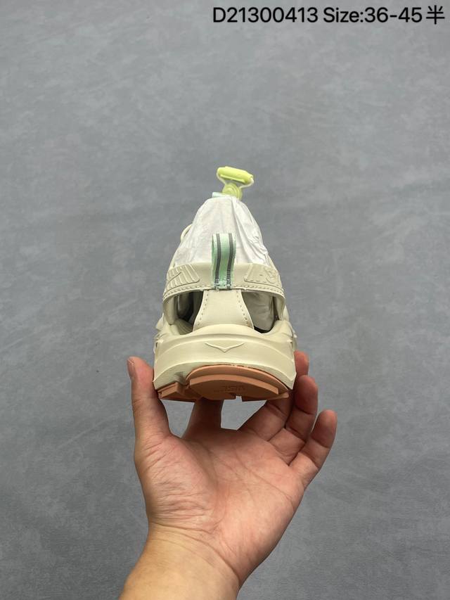 #鞋型从外观就给人强烈的户外机能感,粗犷率性的厚底设计,继承了 Hoka One One 跑鞋 Dna。鞋身采用了氯丁胶打造,搭配抓地力很强的橡胶外底,这款凉鞋鞋身自重非常轻,可以在穿着时更加轻盈舒适。