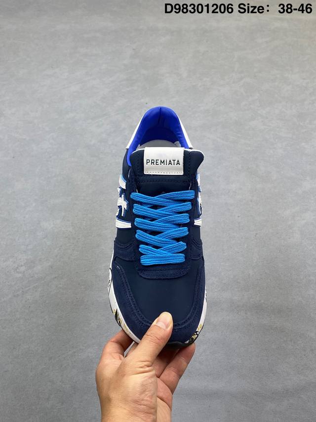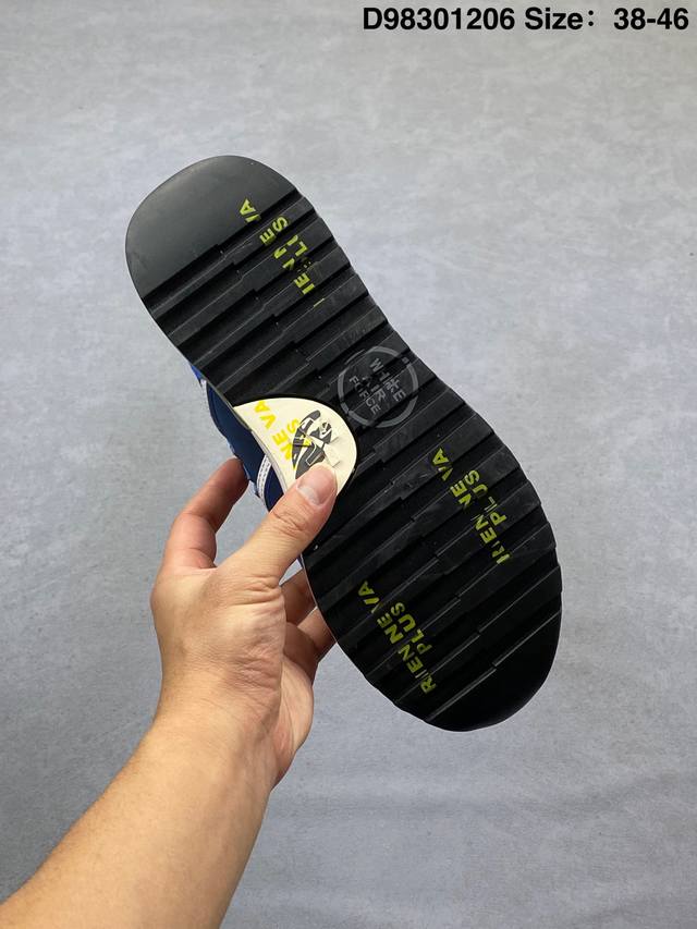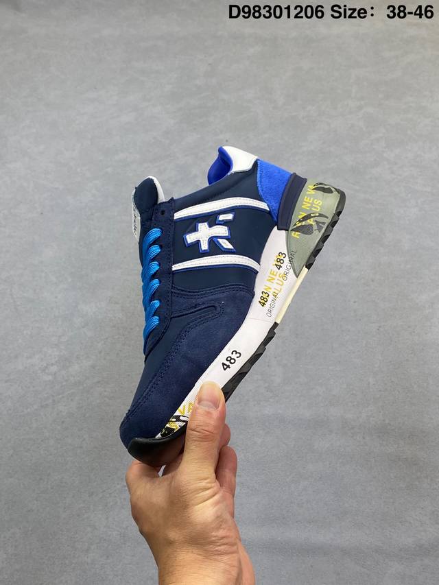premiata 普拉米亚达 男鞋原单出口品质,采用皮革饰片组合固色翻毛皮与复合牛津布鞋面材质,内衬搭载皮革贴附缓震脚垫,中底Eva缓震组合耐磨橡胶鞋底意大利高