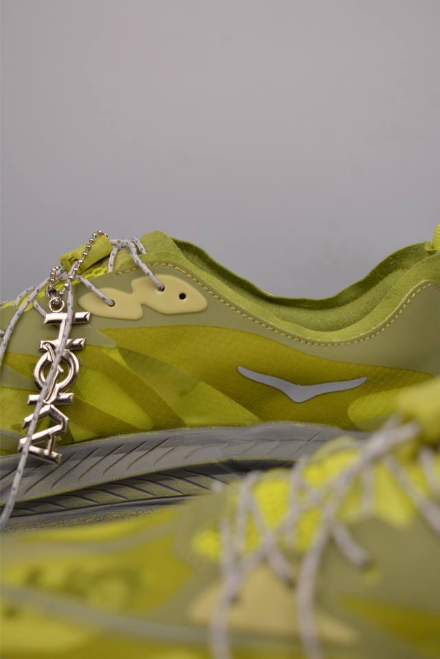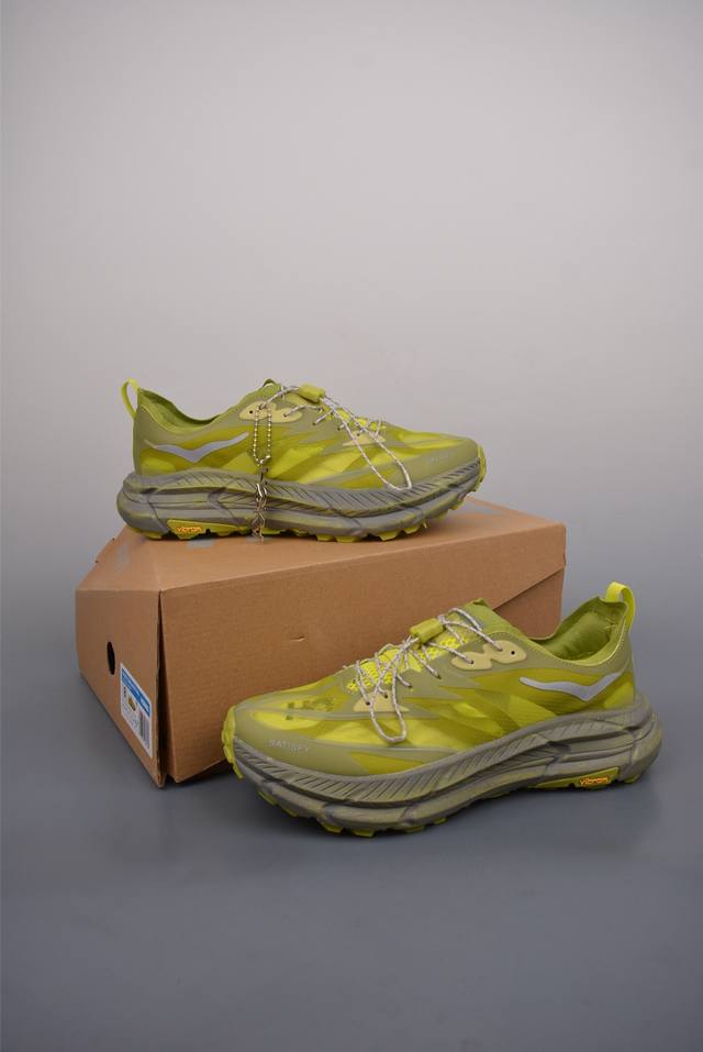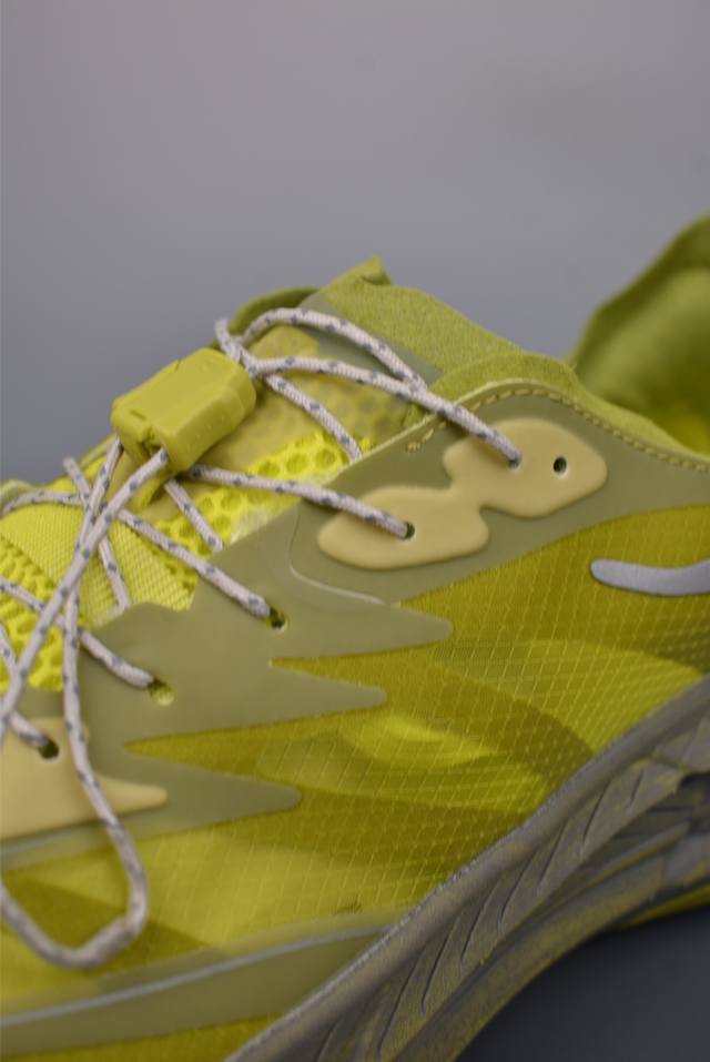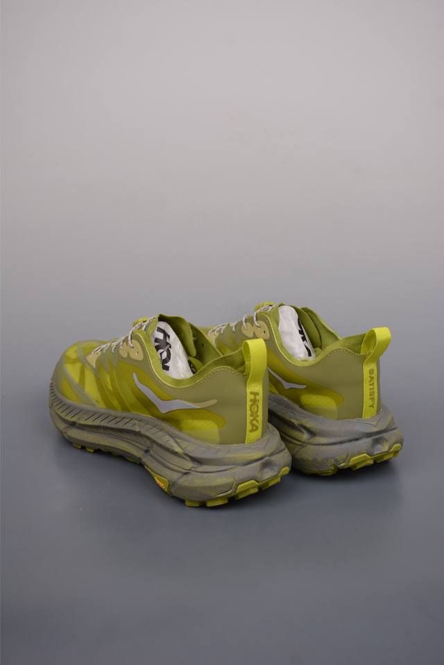 此球鞋继承了Hoka的经典越野鞋型Mafate Speed4的设计 更在此基础上进行了创新和提升 使得它既适合户外越野跑,又充满了时尚潮流的元素。它的半透明鞋面设计 不仅让鞋身看起来更加轻便 而且提供了良好的透气性 而保护性的防撕裂尼龙面料,则确保了在复杂地形中的耐用性。