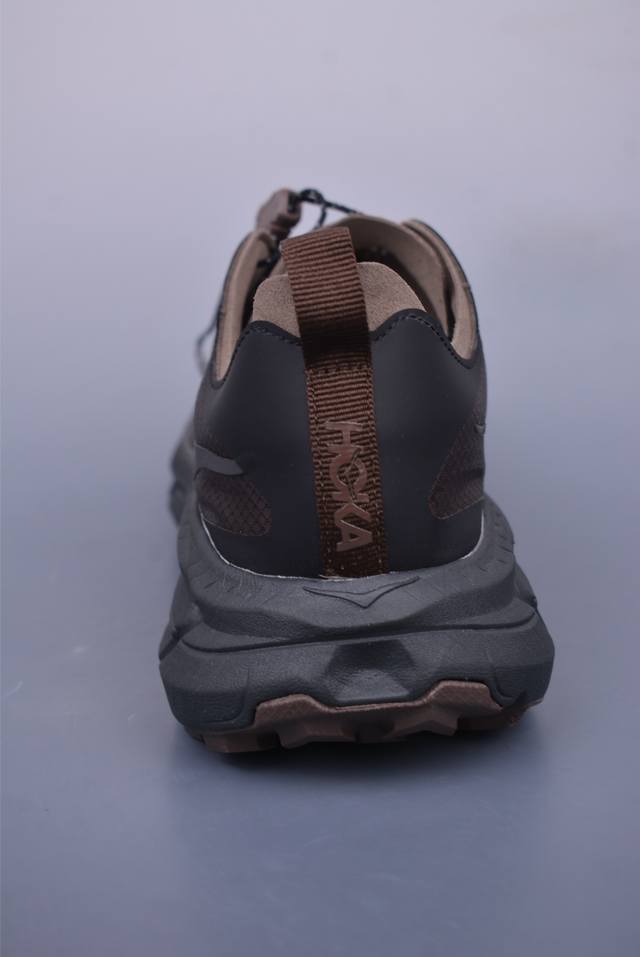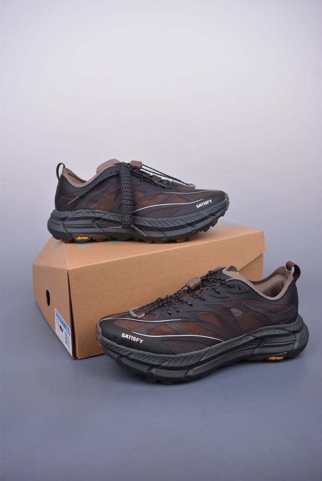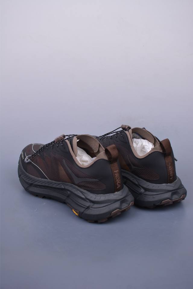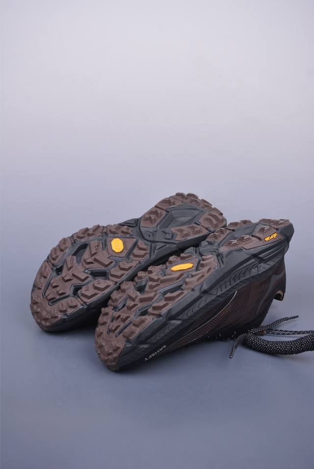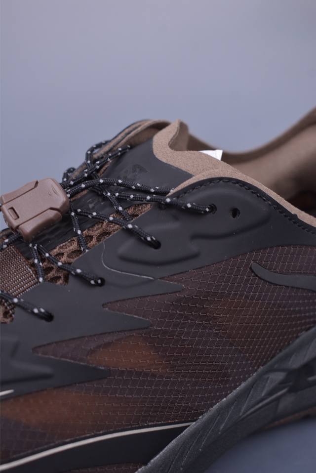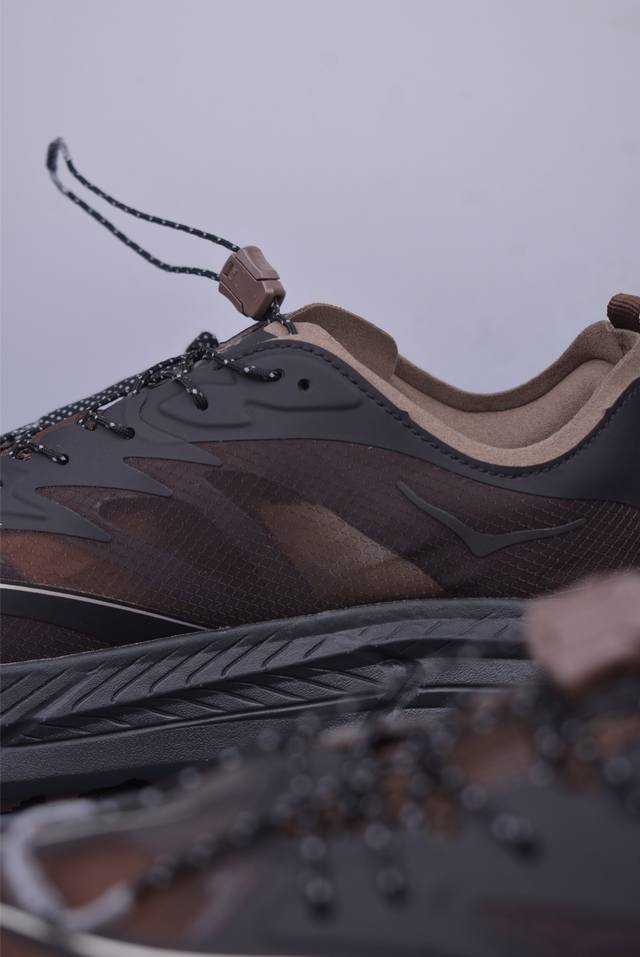 此球鞋继承了Hoka的经典越野鞋型Mafate Speed4的设计 更在此基础上进行了创新和提升 使得它既适合户外越野跑,又充满了时尚潮流的元素。它的半透明鞋面设计 不仅让鞋身看起来更加轻便 而且提供了良好的透气性 而保护性的防撕裂尼龙面料,则确保了在复杂地形中的耐用性。