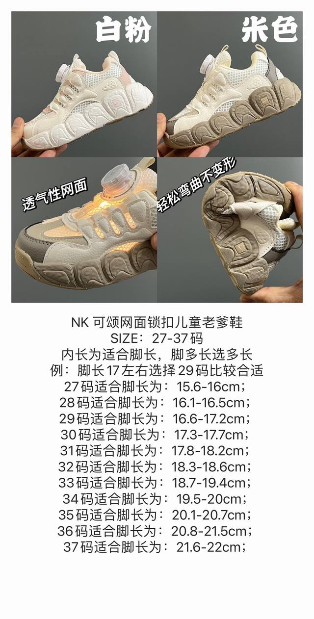/ 价格P下调 Nk 可颂网面锁扣儿童老爹鞋,尺码表更新 Size:26-38码 网面设计,透气舒适 可爱得可颂面包底 精致锁扣设计,轻松调节 优质面料拼接,质感满