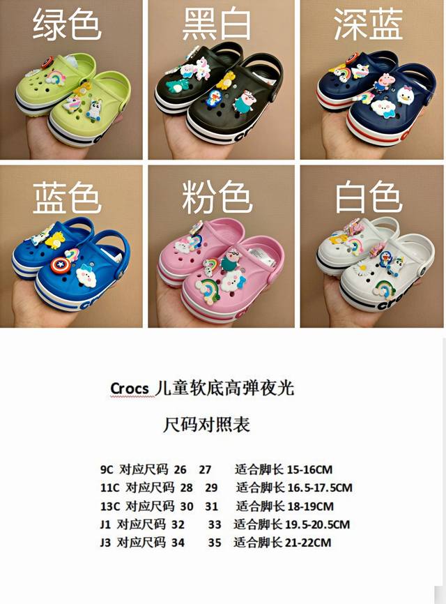 【含4个Led随机搭配和 6个普通配饰随机搭配】配件丢失或者损坏不退换 脚宽脚胖的人可以正常选码 Crocs 沙滩洞洞鞋童鞋拖鞋,凉鞋两穿,洞洞不仅仅是可以透气,也可以很好的装饰,灰常卡哇伊 洞洞鞋的代名词= 柔软、灵活及轻便舒适,Crocs核心“灵魂”在于神奇材质 Croslite,它是一种泡沫材质, Size:9C=26 27 11C=28 29 13C=30 31 1J=32 33 3J=34 35尺码相当于26-35