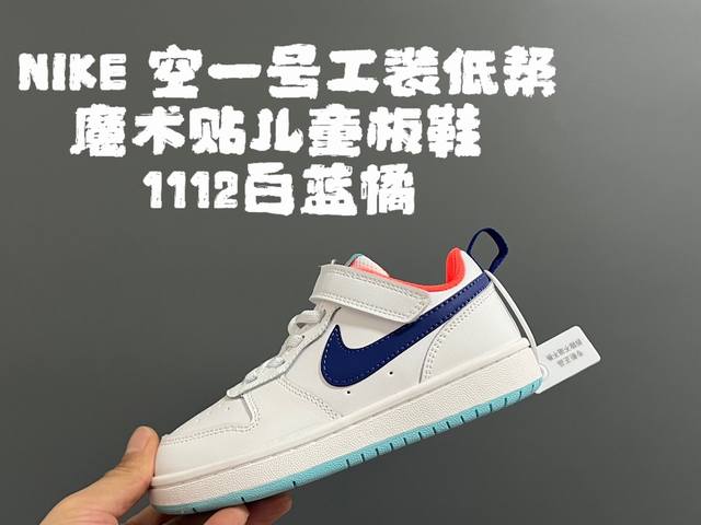 nk 空一号工装低帮魔术贴儿童板鞋小白鞋 Size:24-37码 经典百搭板鞋小白鞋,学生时代必备 低帮魔术贴设计,穿脱方便 橡胶大底,耐磨防滑 优质皮料拼接,