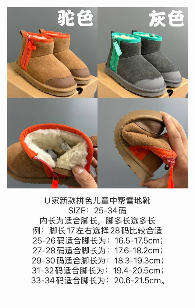 U家新款拼色儿童中帮雪地靴 Size:25-34码 经典Ugg款式 拼色设计,颜色超好看 内里加绒,保暖又舒适