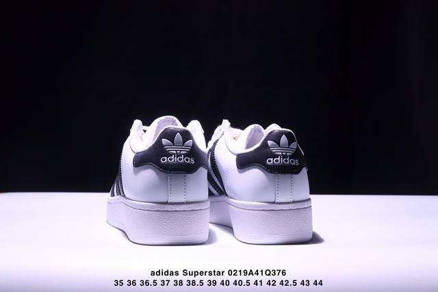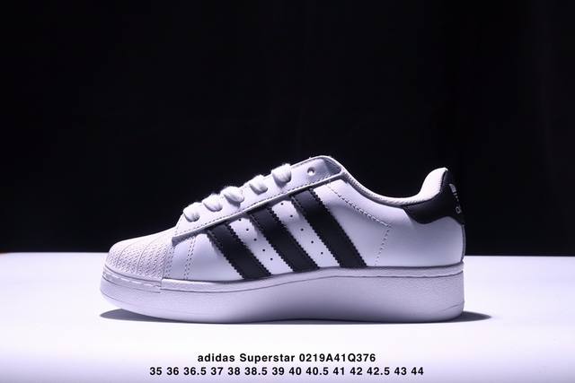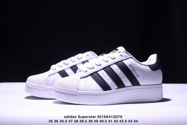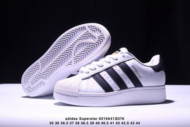 公司级Ad Originals Superstar 经典复古贝壳头厚底板鞋 Ig4477 诞生于1969年 是第一双将全皮面鞋 身与橡胶鞋头结合在一起的低帮篮球鞋 Superstar最开始 是作为高帮篮球鞋Pro Model的低帮版本而出现的 但因为其独特和醒目的橡胶鞋头造型而让大家熟知 被大家形象地称为 Shelltoe 贝壳头 在70年代的美国职业篮球场上 接近3 4的Nba球员都将这双Superstar作为场上用鞋 80年代之后 经过不断的改良和发展 Superstar逐渐成为横跨时装、音乐、街头文