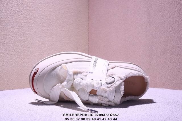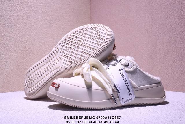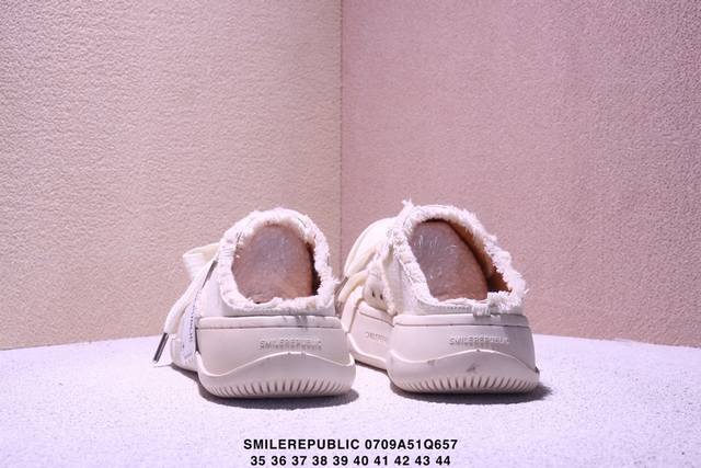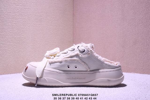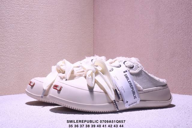 广东原产,采用原装定制高密度帆布革鞋面材质,超软水染牛皮内里 注塑成型鞋垫,4Cm厘米外增高效果橡胶鞋底徐璐,李晨,檀健次同款,新晋街头鞋履品牌Smilerepublic Canvas Mule Sneakers Low 松糕厚底增高低帮反系带一脚蹬乞丐风帆布露跟板鞋