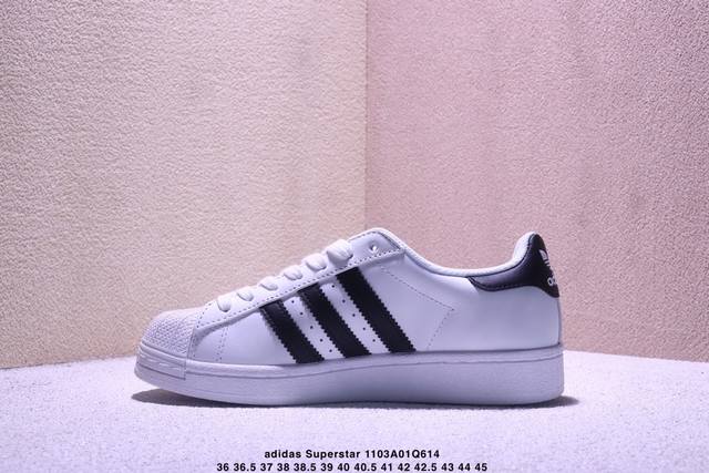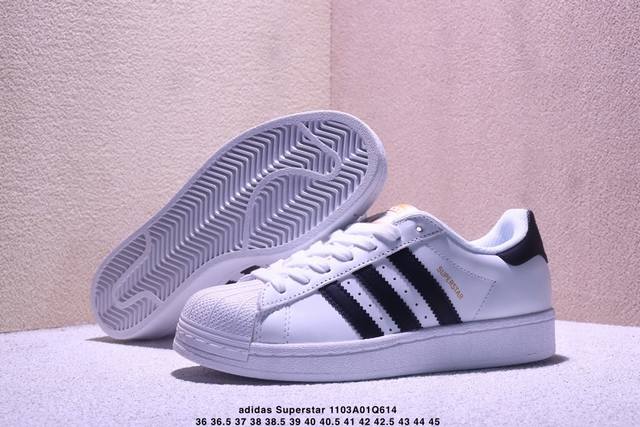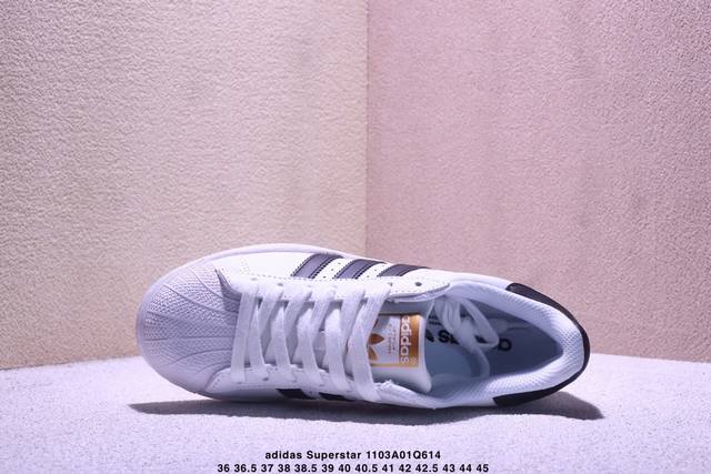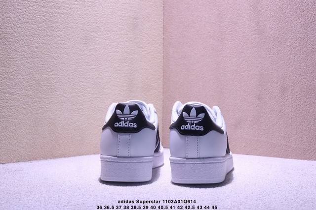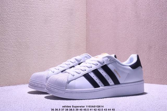Ad Originals Superstar 经典复古贝壳头板鞋 Eg4958 诞生于1969年 是第一双将全皮面鞋 身与橡胶鞋头结合在一起的低帮篮球鞋 Superstar最开始 是作为高帮篮球鞋pro Model的低帮版本而出现的 但因为其独特和醒目的橡胶鞋头造型而让大家熟知 被大家形象地称为”Shelltoe“贝壳头 在70年代的美国职业篮球场上 接近3 4的Nba球员都将这双Superstar作为场上用鞋 80年代之后 经过不断的改良和发展 Superstar逐渐成为横跨时装、音乐、街头文化、休闲和
