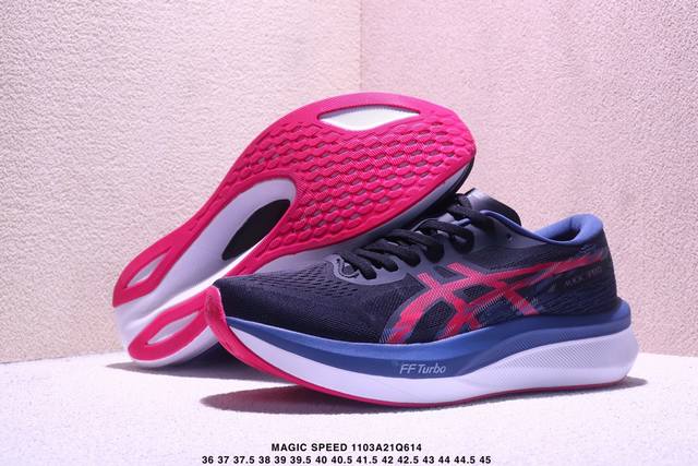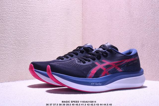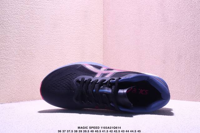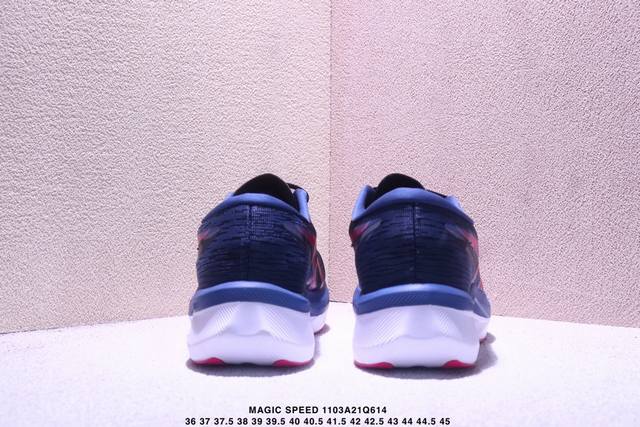 / Asics 亚瑟士Magic Speed 4稳定跑鞋鞋面采用双层提花网面设计,提高包裹性和透气性,后跟搭载稳定系统科技T-Gel提升整体支撑力和结构感,减少对身