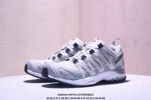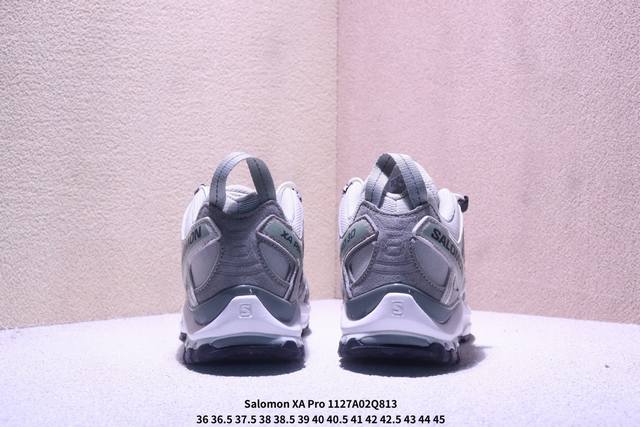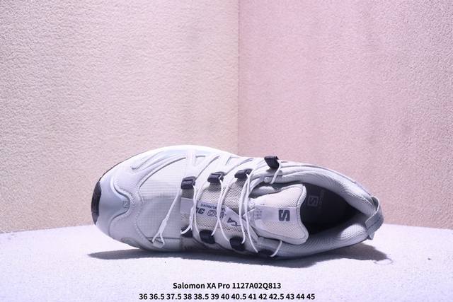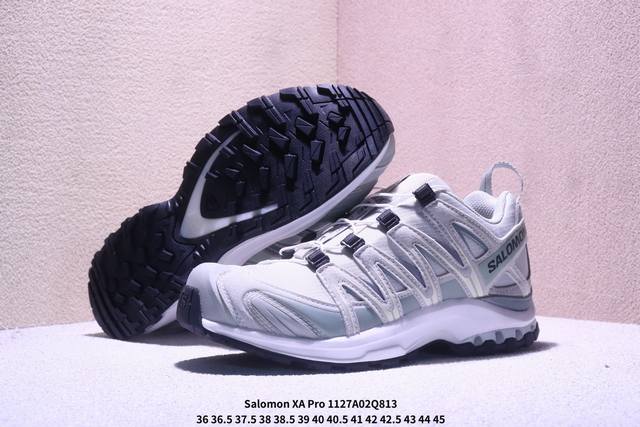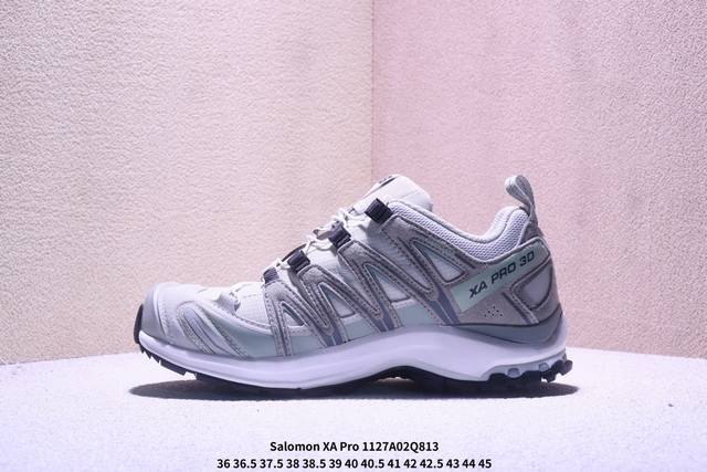 Salomon 萨洛蒙 原楦原纸版开发,采用耐磨牛巴革组合防护网织布鞋面材质,牛角扣系带开合,外置3D Chassis鞋底结构组合Contagrip耐磨胶状材质
