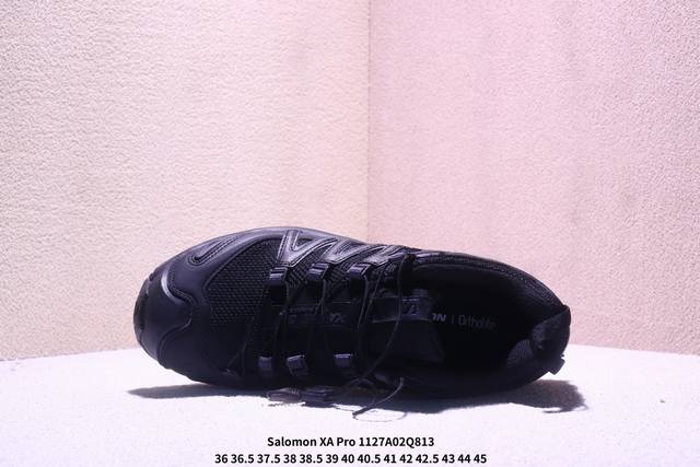 Salomon 萨洛蒙 原楦原纸版开发,采用耐磨牛巴革组合防护网织布鞋面材质,牛角扣系带开合,外置3D Chassis鞋底结构组合Contagrip耐磨胶状材质
