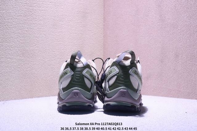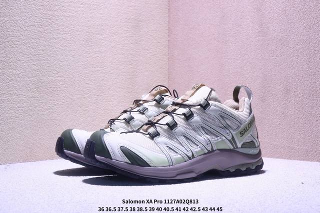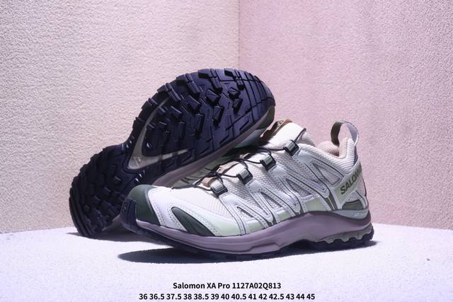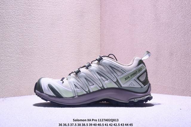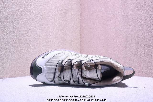Salomon 萨洛蒙 原楦原纸版开发,采用耐磨牛巴革组合防护网织布鞋面材质,牛角扣系带开合,外置3D Chassis鞋底结构组合Contagrip耐磨胶状材质