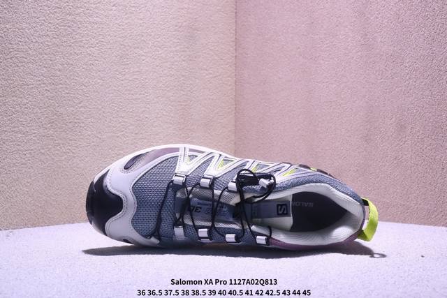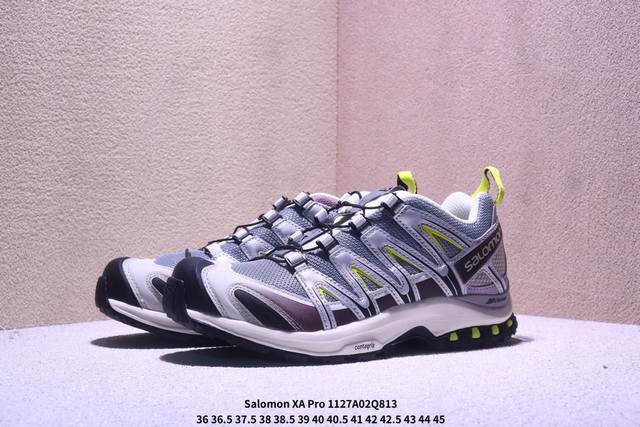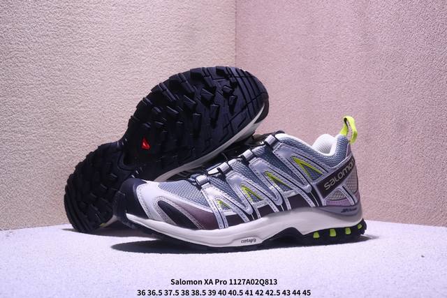 Salomon 萨洛蒙 原楦原纸版开发,采用耐磨牛巴革组合防护网织布鞋面材质,牛角扣系带开合,外置3D Chassis鞋底结构组合Contagrip耐磨胶状材质