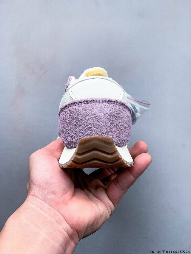 标志性的鞋头设计与加宽鞋带相结合,让鞋型更显修长利落;鞋舌处外露的海绵细节,不仅增添了复古层次感,更唤起了人们对70年代跑鞋的经典回忆。轻薄的 Eva 中底不仅提供了舒适的回弹和稳定的支撑,还为穿着者带来轻盈的脚感,无论是穿梭于都市街头,还是漫步于户外,都能轻松应对。