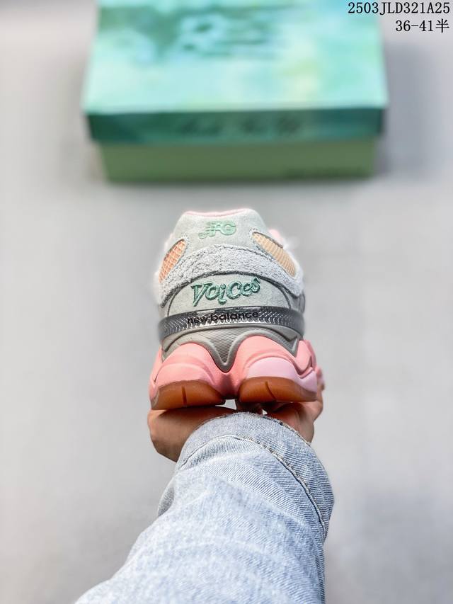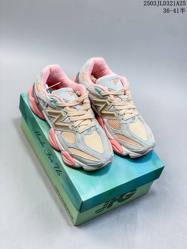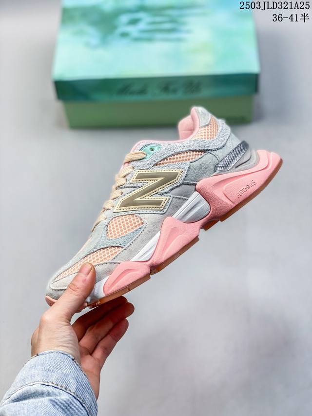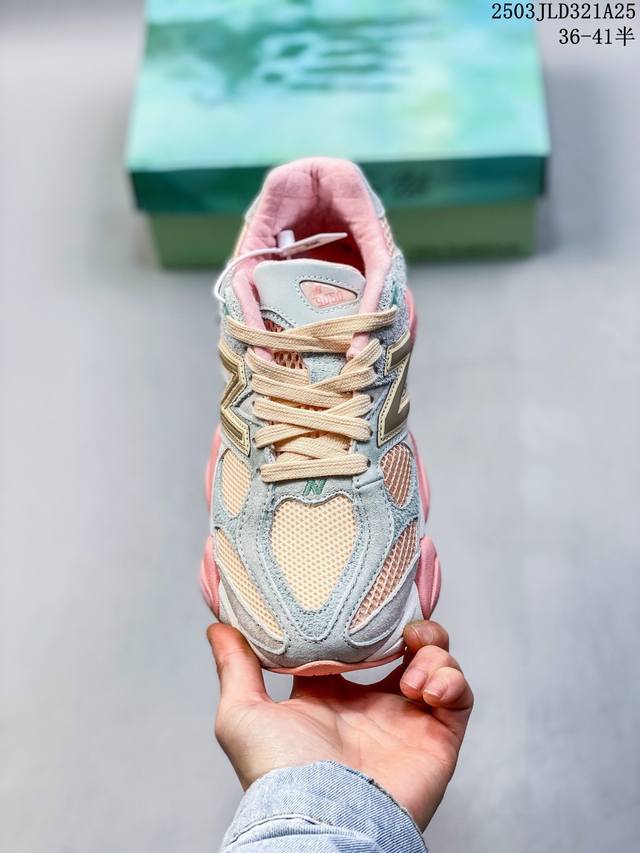 新百伦 Joe Freshgoods X New Balance Nb9060 联名款 复古休闲运动慢跑鞋 #鞋款灵感源自设计师本人对夏日的怀日回忆。鞋面大身由空间双格及磨砂鞋面拼接而生,配以柔和、温暖的粉橘色调,夏日氛围拉满 #采用大面积网眼以及皮革材质覆盖鞋身,还原经典气质。搭载Abzorb避震科技,由泡沫聚酯制成,上脚可以有效减少由鞋底反弹对身体及双腿的冲击力