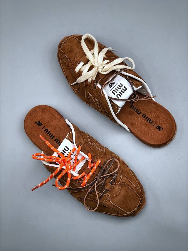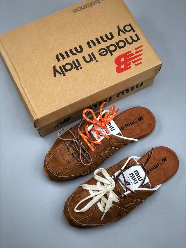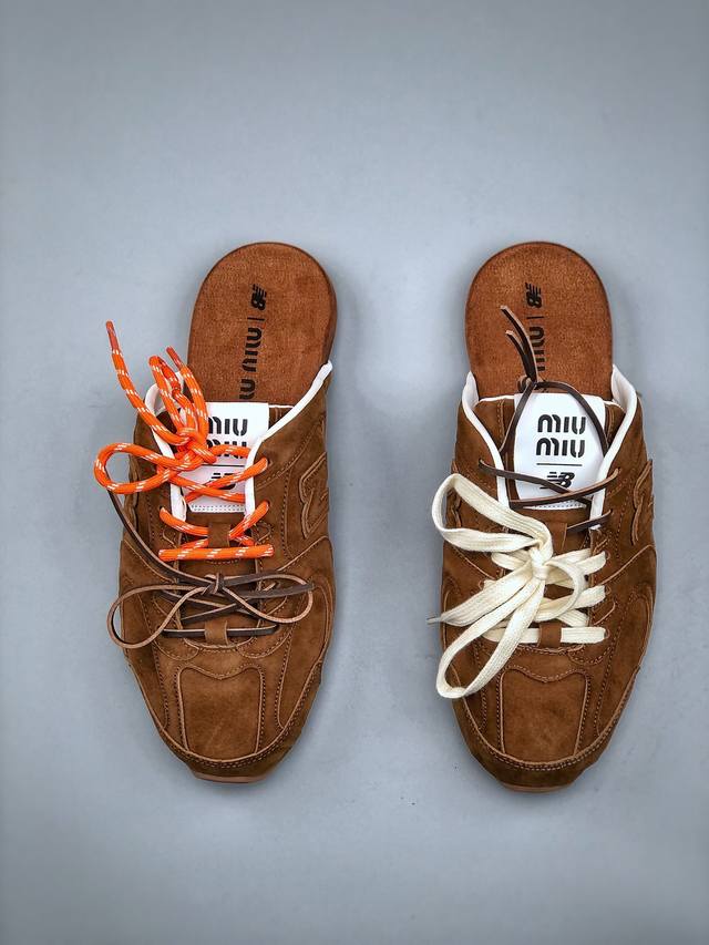 340支持放店 Miumiu缪缪 X New Balance Nb530 情侣款 休闲 运动鞋 阿甘鞋 德训鞋 原版开发 经典Nb530运动鞋中汲取灵感推出了自己的迭代版本530Sl。该运动鞋采用解构和轻盈的设计,有棕色和米色配色,带点彷旧的布料包覆着 New Balance 530的轮廓,刻意磨损、不均匀的皮革色调,让波鞋多了不同的个性 这款联名鞋款配有双鞋带设计,包括白色、橙色、棕色和黄色鞋带,营造出随性系起的感觉,为整体感又多了几分 Boyish 以及率性感 24S开春走秀场曝光、非常流行的美拉德配