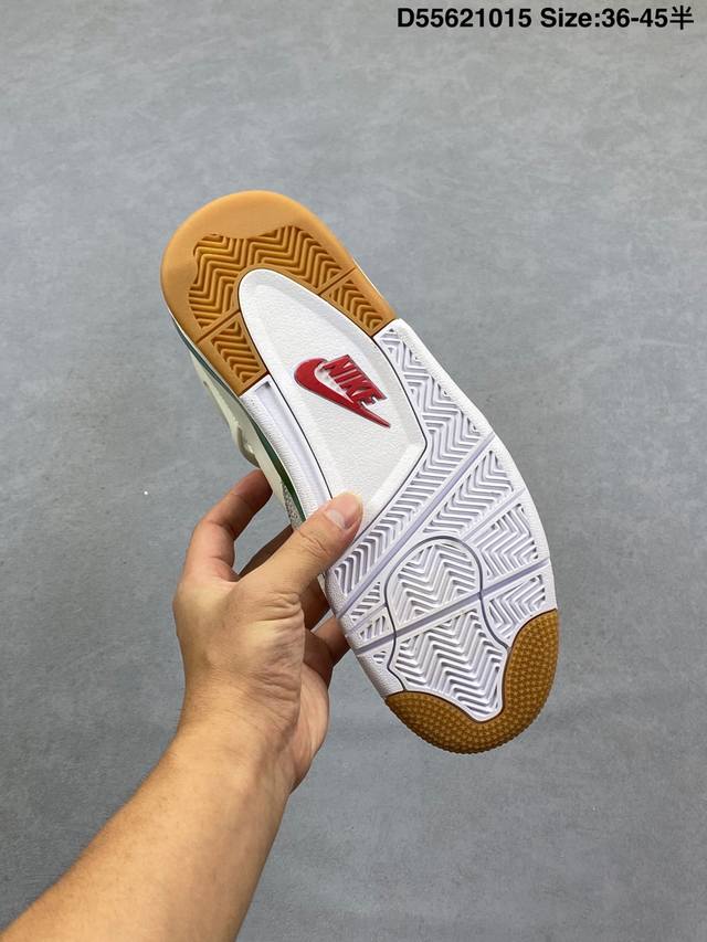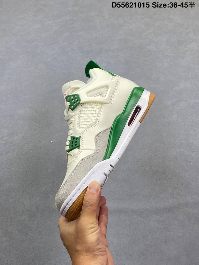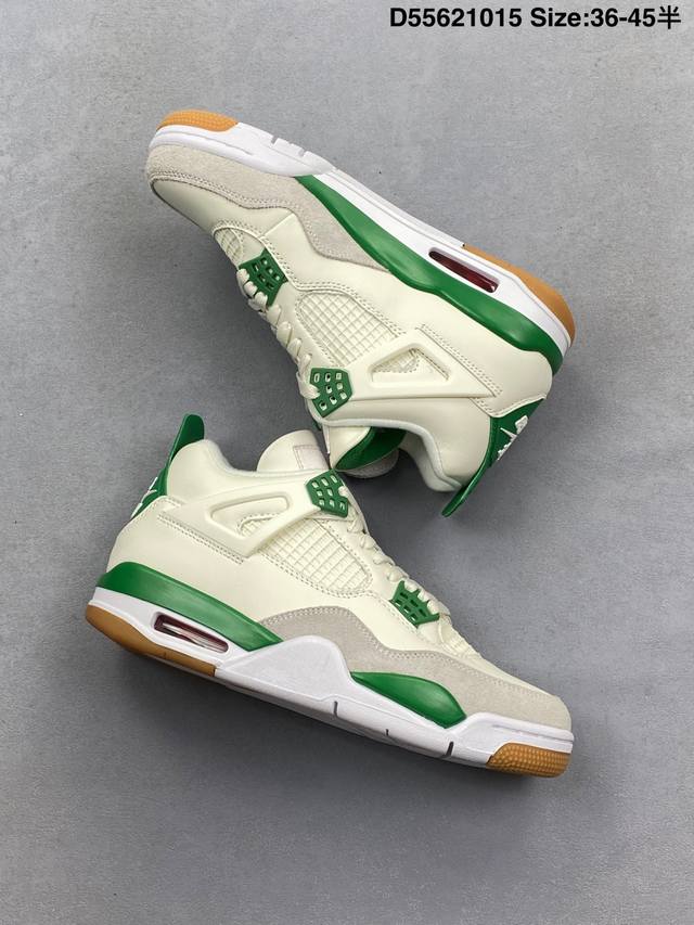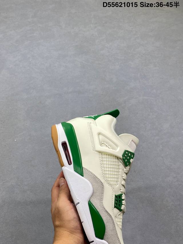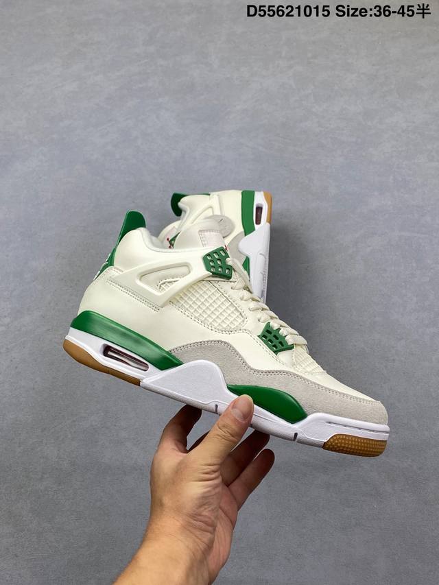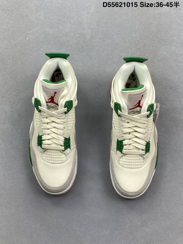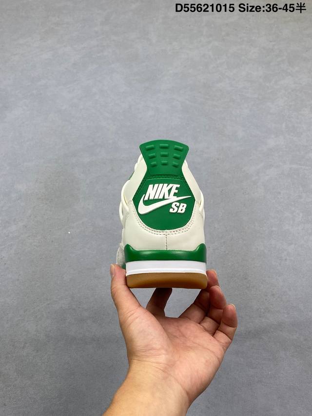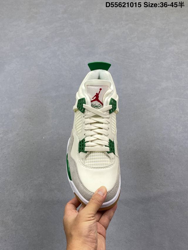 外贸版本 全头层 Nike Sb X Air Jordan 4 Retro Pine Green 绿松石联名款 Aj4 乔丹4代 Aj4 乔4 绿白联名 乔丹篮球鞋系列 本次联名鞋款维持Air Jordcan 4经典轮廓,鞋身以白色为主,细节部分选用绿色点缀,鞋头部分还带有灰色麂皮覆盖,鞋底部分采用复古感十足的牛筋底,成功营造清爽氛围,并于鞋舌背面、Flight字样、鞋带扣、中底区域、鞋后跟、拉环注入主题色 Pine Green ,其余细节则能留意经典红色Jumpman Logoo,灰色绒面革覆盖层与生胶