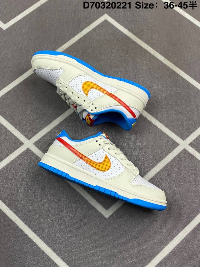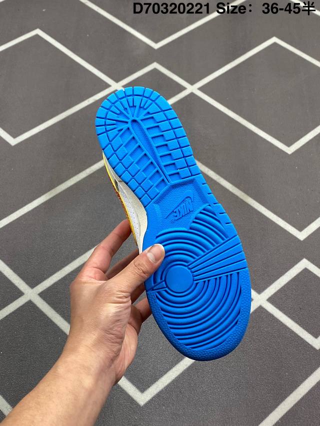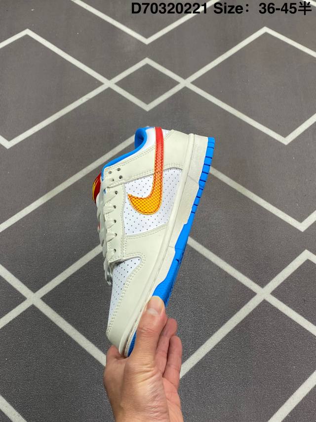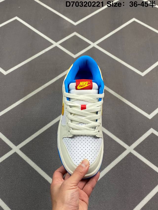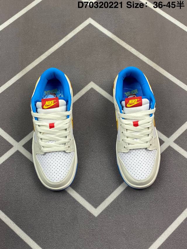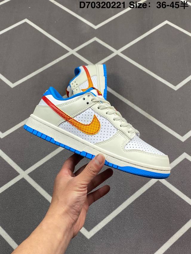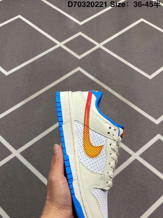 Nike Dunk Sb Low Harlemglobetrotters 耐克 Sb 低帮 哈莱姆白蓝色 整体配色方案充满活力,灵感来源于哈莱姆环球旅行者队的著名制服,整双鞋以白色为主要色彩方案,在细节上辅以多色点缀,鞋身是优质皮革打造,质感拉满。鞋身两侧Swoosh Logo采用了渐变设计,是这双球鞋的亮点之一,细节方面,鞋舌红色绣标上点缀黄色Nike Swoosh Logo,蓝色的衬里和外底与鞋面的白色形成对比,色彩搭配协调且独特,鞋垫有特殊的哈莱姆环球旅行者队主题图案,最后以白色中底