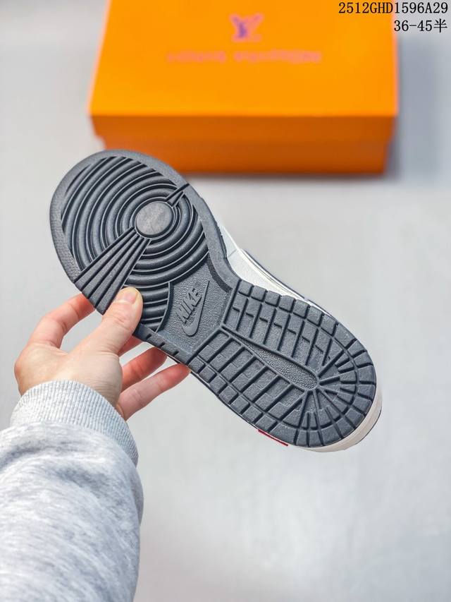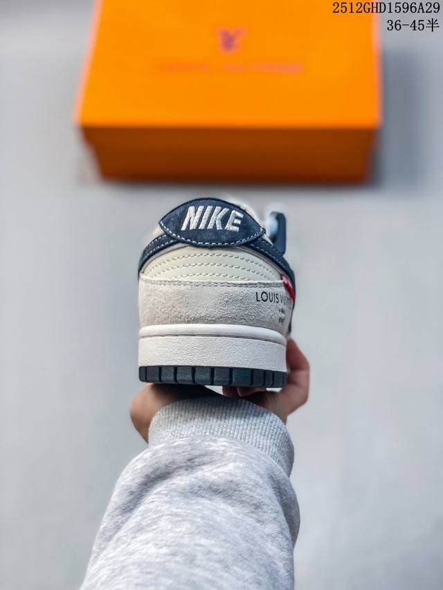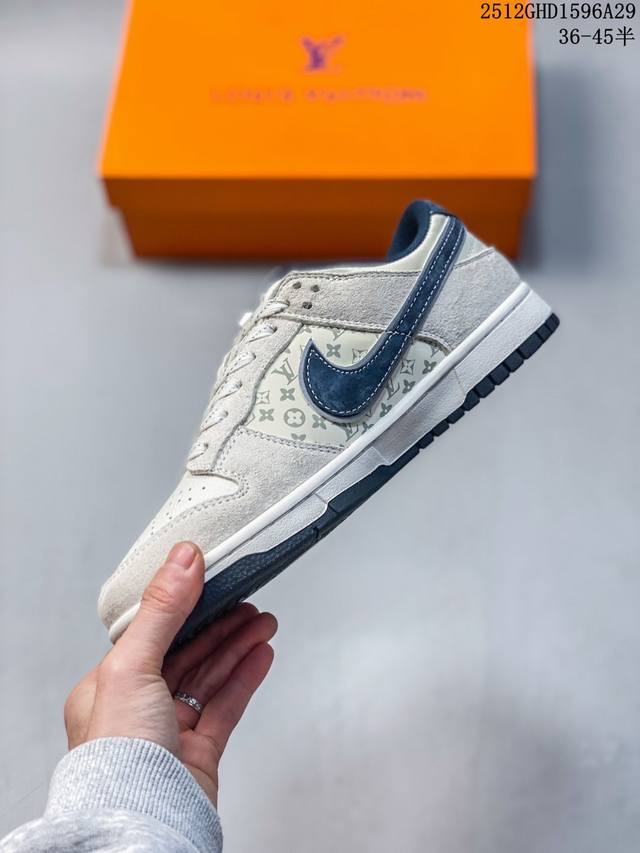 奢潮交融,低帮新篇|Nike Dunk Low X Louis Vuitton联名款 !当Nike Dunk Low的复古街头骨架邂逅Louis Vuitton的奢雅美学基因,这双Kg6699-F03联名款成为奢潮跨界的标杆之作,将街头的随性与高奢的精致碰撞出极致火花。鞋身以浅米翻毛皮革为基底,藏蓝色麂皮Swoosh利落勾勒出经典轮廓,材质的细腻纹理与色彩的柔和碰撞,营造出高级又随性的视觉层次。鞋侧暗藏的Lv经典Monogram老花暗纹,为街头鞋型注入低调奢华的底蕴,鞋头的Lv标识刺绣、后跟的“Louis