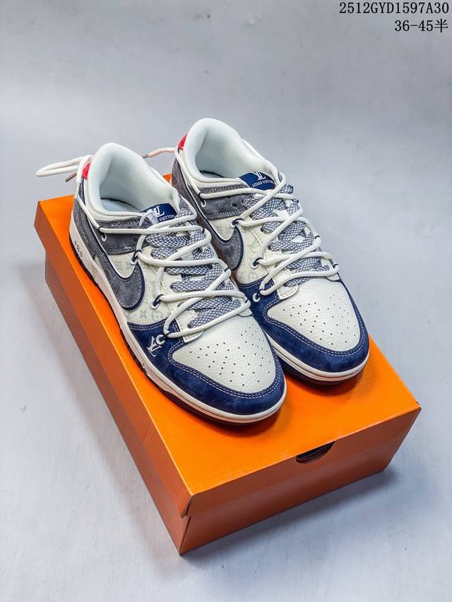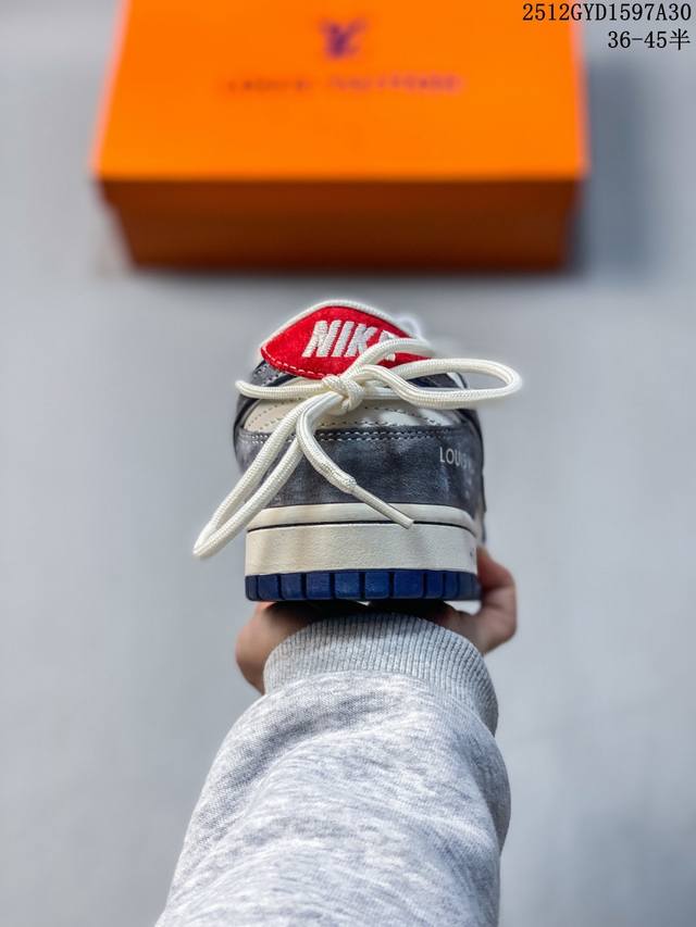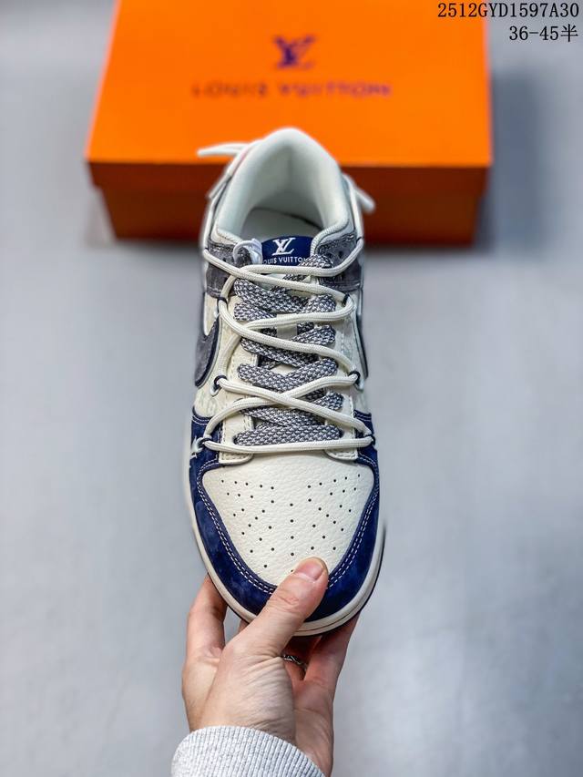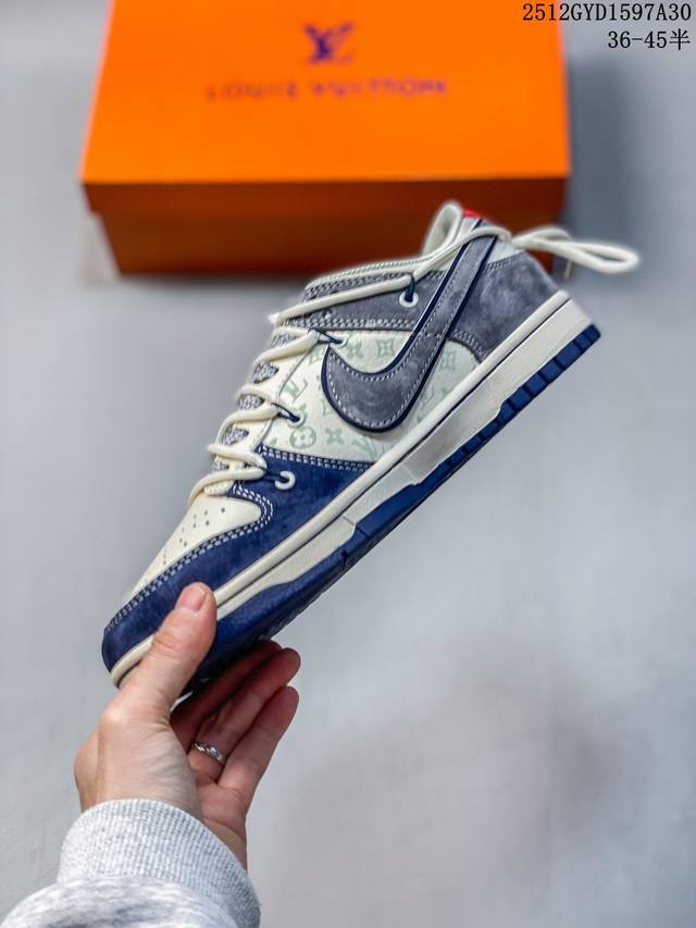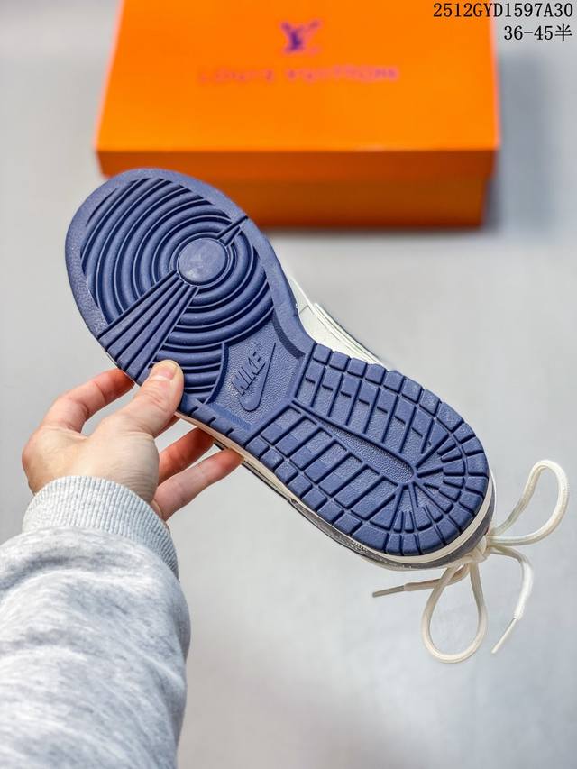 奢潮融合,板鞋新章|Nike Dunk Low X Lv定制款Cx5050-Y42当滑板经典Nike Dunk Low邂逅奢侈王者Louis Vuitton,这双Cx5050-Y42直接将高奢质感与街头基因熔铸成潮流新标杆!鞋身以米白皮革为底,拼接深海蓝翻毛皮鞋头、烟灰麂皮鞋帮,多层次的材质碰撞让视觉质感瞬间拉满;鞋侧Swoosh叠印Lv经典老花图案,鞋头的Lv字母标识、后跟的“Louis Vuitton 1854”字样,把奢牌底蕴藏进街头细节;鞋带处的抽绳设计打破常规,为经典Dunk轮廓注入了不羁的潮流