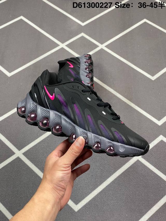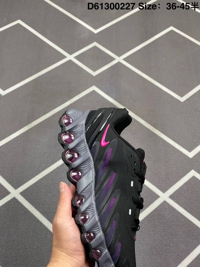 新品 耐克 Nike Air Max Dn8 全掌气垫科技运动跑步鞋Fq7860-005。鞋款采用醒目渐变织物和动态波浪状结构鞋面,搭配黑色中底和外底,以及迷你黑色 Swoosh 标志,采用 8 根压柱 Dynamic Air 气柱,将从鞋跟到脚尖的“Dynamic Air”系统直接配置在橡胶的外底上,尽可能缩短与地面的距离,实现平滑的体重移动,即刻上脚,享受非凡运动体验。环保纤维革饰片组合网眼布鞋面,耐弯折热塑框架支撑鞋身。中底搭载Eva轻量缓震,前掌和后跟配备了 Air Zoom 气垫单元。正确后跟T