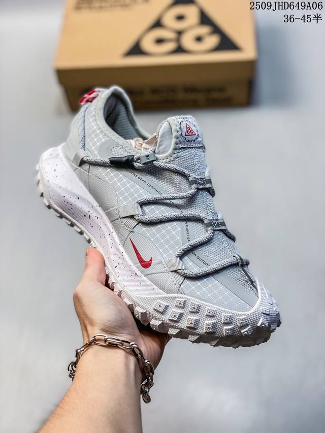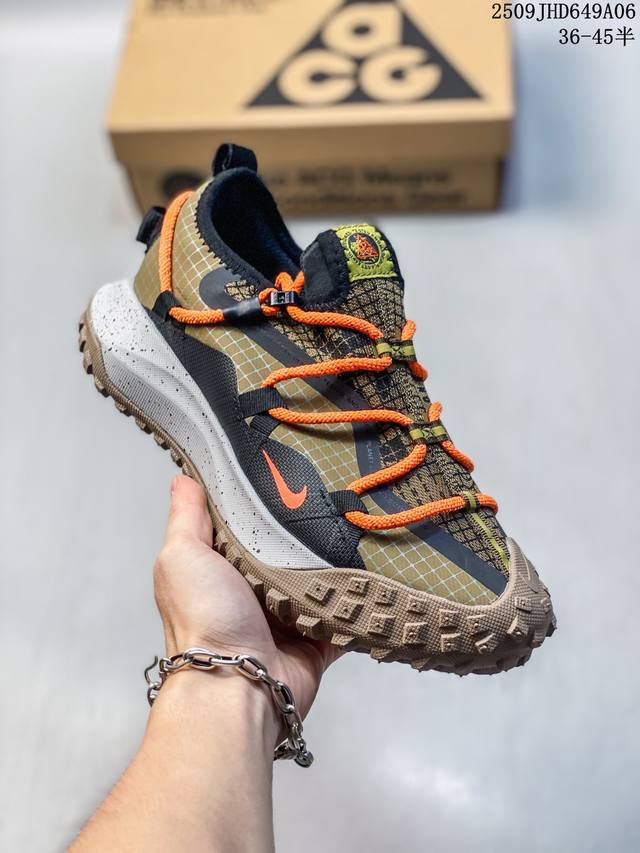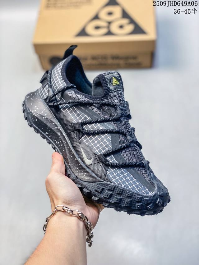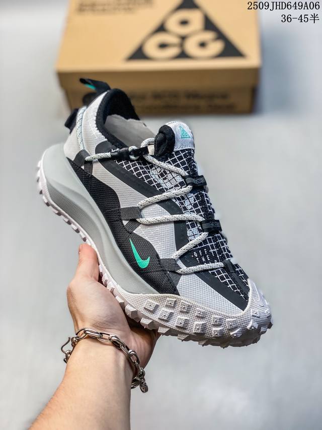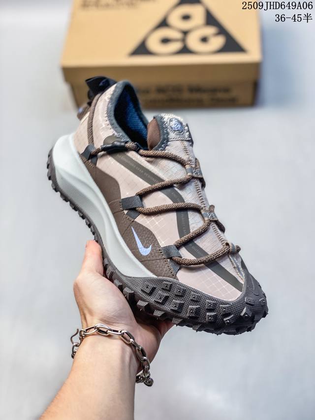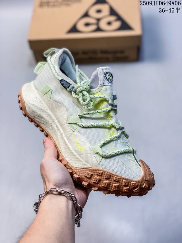 坚固的户外外底以及 Acg 品牌和 Air Mowabb 标志。
