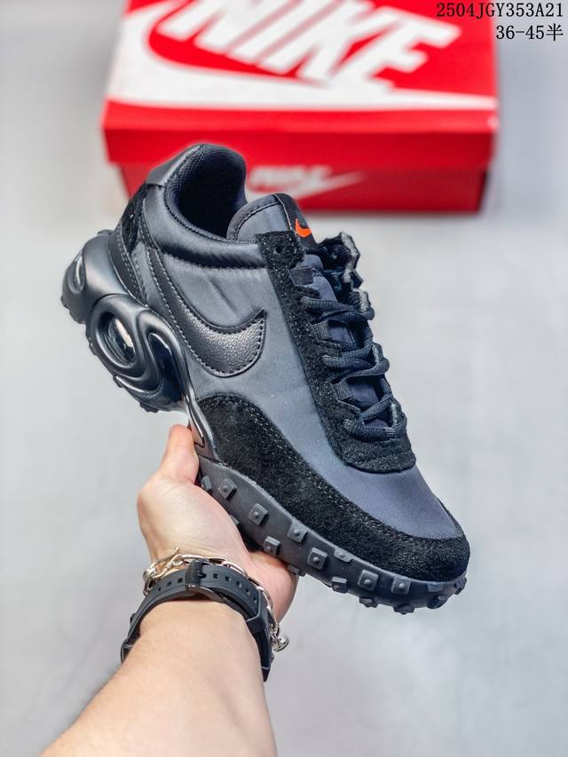 此款 Air Max Waffle’Black And Anthracite‘根植经典,匠心糅合 Nike 两大革命性鞋款,打造前卫的创新设计。该鞋款沿袭 Air Maxplus 的经典中底和Tuned Air 缓