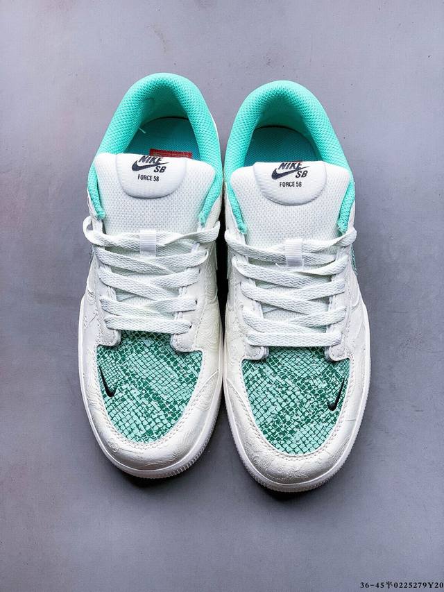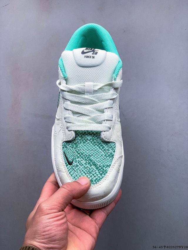 / 耐克Nike Sb Force 58是一款将前沿创新带入街头的单品,它具有硫化杯底,具有出色的耐用性和灵活性。使用帆布和绒面革,在饰面上放置通风口,它自始至终都