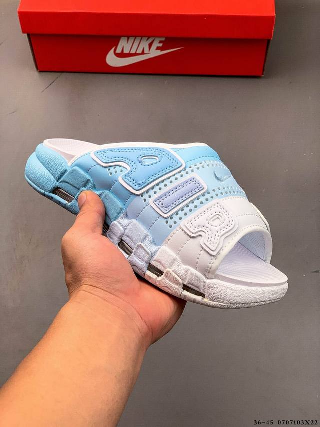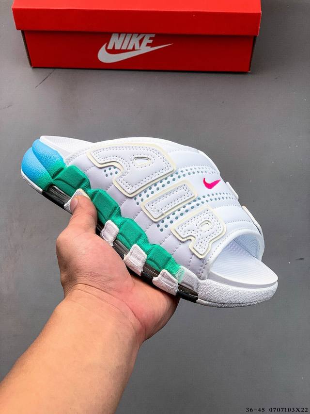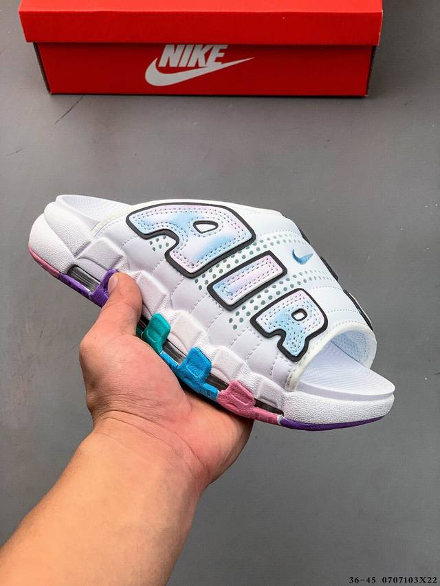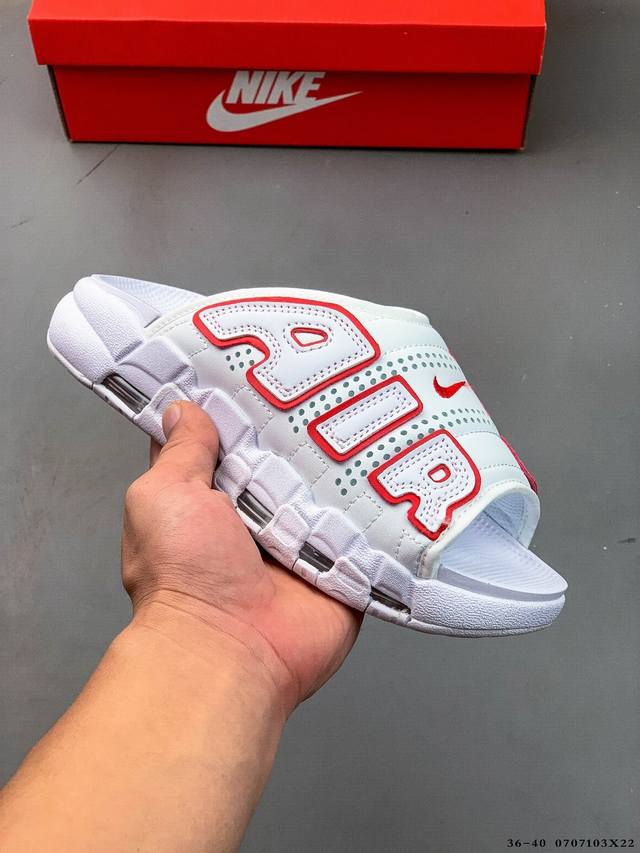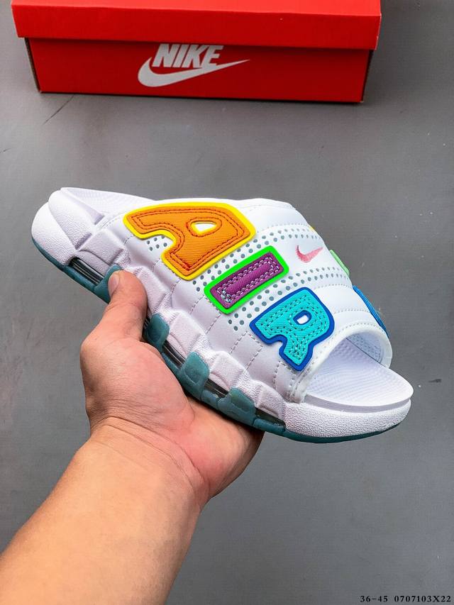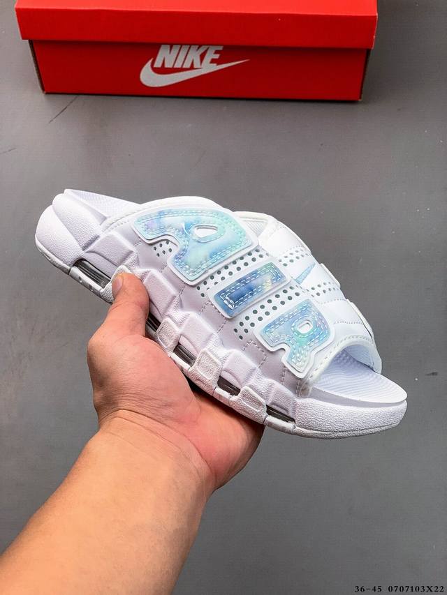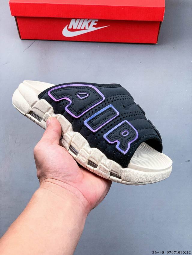 Nike Air More Uptempo Slide皮蓬拖鞋 Dv2132-001 以流行于街头的涂鸦文化为设计灵感,整体的设计风格夸张而充满魅力,厚实而充满质感的皮质鞋面两侧印刻了一对巨大的字母“Air”,独特炫酷的外观惊艳无比