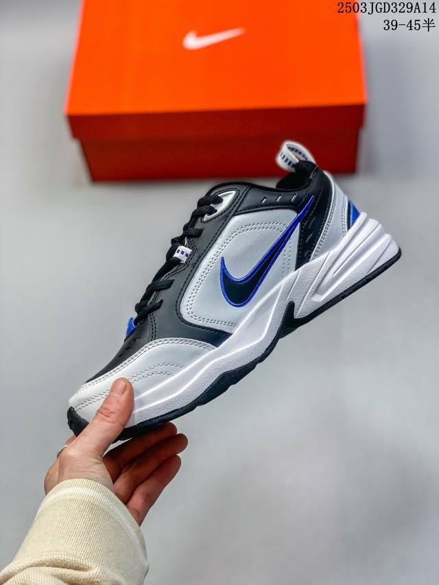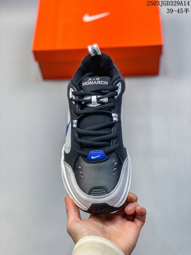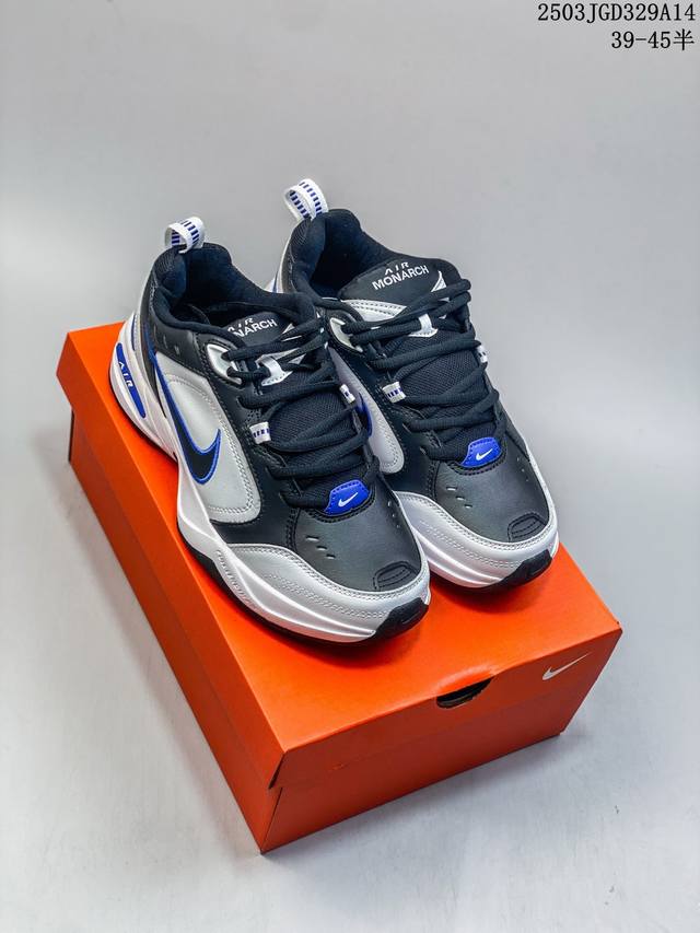 【真标】耐克 Nike Air Monarch Iv男子训练鞋厚底老爹鞋休闲复古运动鞋。Nike Air Monarch Iv 运动鞋为你打造出众的训练装备,耐穿鞋面提供有效支撑。轻盈泡绵结合 Nike Air 缓震配置,塑就舒适非凡的迈步体验。皮革、合成材质与织物组合鞋面,塑就经典外观,经久耐穿,全掌内嵌式 Air 缓震配置,缔造出众缓震体验,舒适非凡,支撑力强,硬质橡胶外底经久耐穿,提供可驾驭多种地面的出众抓地力。