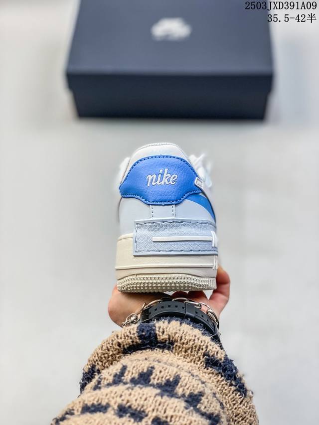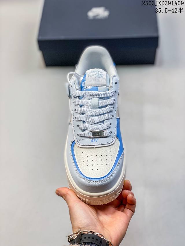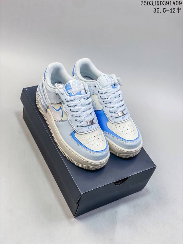 Nike 耐克低帮板鞋 空军一号 Af1马卡龙 Af1厚底增高百搭运动板鞋 Nike Air Force 1 “Shadow” 造型设计上与 Sacai X Nike 系列颇为相似,带有浓厚解构风格,侧身 Swoosh 采用叠加的形式呈现,同时后跟也将标志性 “Air” 字样叠加,整体表现极为个性。