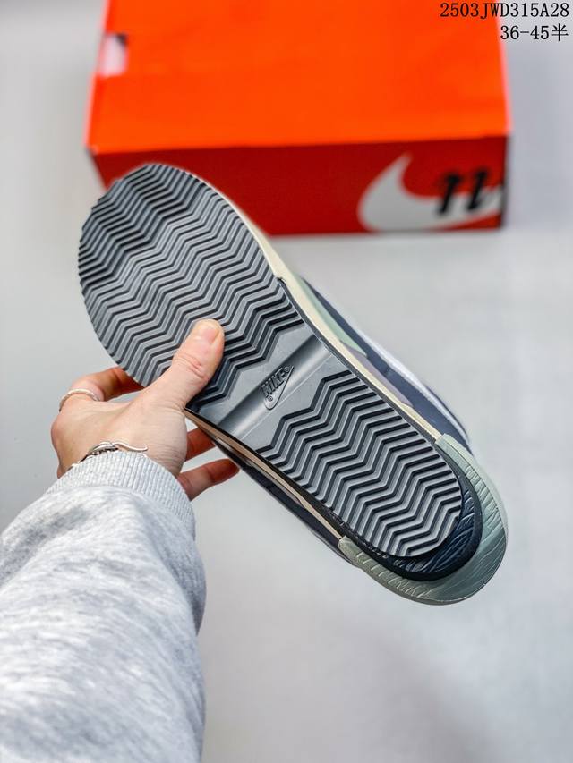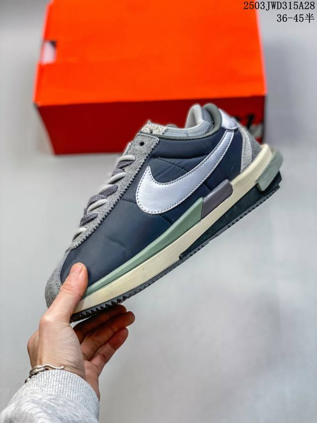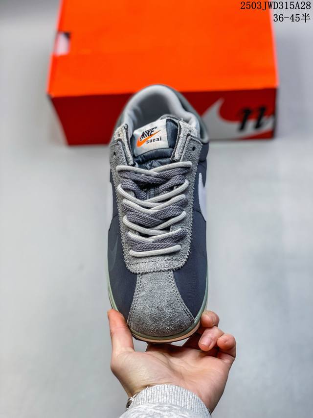 男女鞋真标半码制#升级原楦原纸版开发版型#采用头层皮革饰片组合厚实牛津布与翻毛皮革鞋面材质#中底嵌入超轻发泡Eva缓震材质及4层组合鞋底型#前掌嵌入Air Zoom开窗式纤维气垫经典阿甘跑鞋诞生 50 周年纪念款,日式解构美学联名Sacai X Nike Air Zoom Cortez Sp 10"Grey White"华夫4代系列改良阿甘低帮解构厚底老爹风休闲运动慢跑鞋“厚布白绿红钩子”