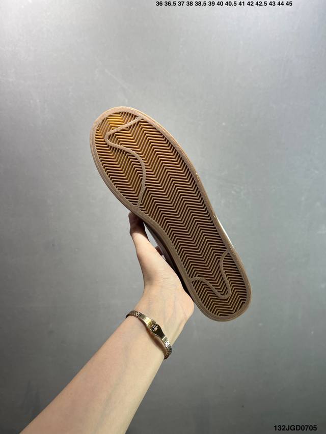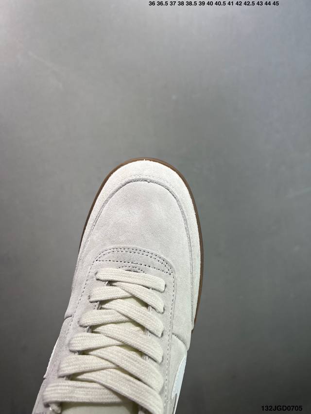此次品牌选用Nike旗下经典带款Nikekillshot 鞋款为蓝本,采用帆白色、藏蓝色和生胶色的配色设计。帆布与魔皮材质打造的鞋身,质感十足。